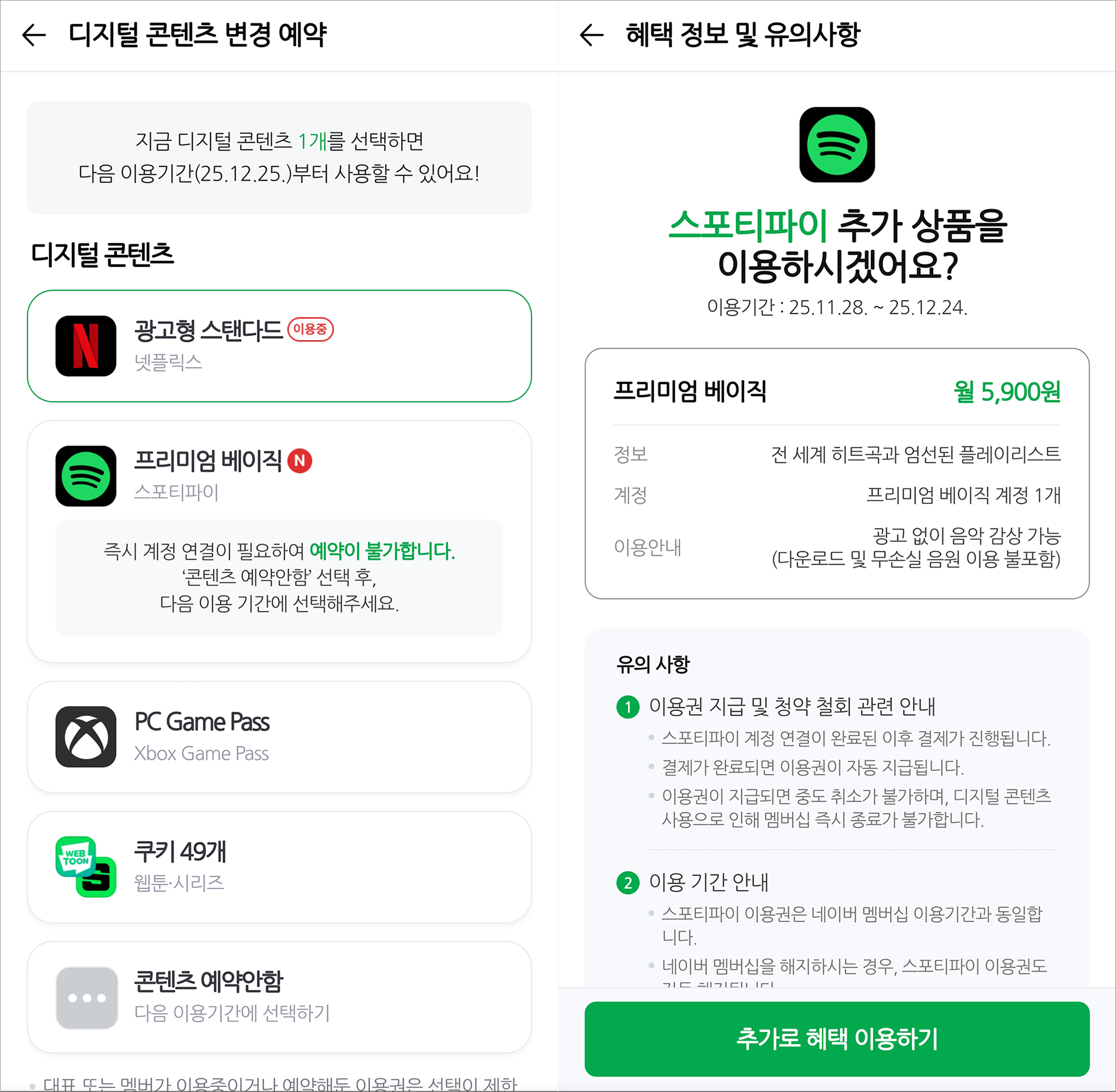 네이버플러스 멤버십은 평소에 네이버의 생태계에서 많은 제품을 구매하는 분들에게는 상당히 메리트있는 서비스라고 할 수 있는데요. 특히 디지털 콘텐츠 이용권의 경우에는 우리가 많이 사용하는 넷플릭스나 엑스박스 게임패스 그리고 스포티파이까지 포함하고 있어서 훨씬 더 유용해졌습니다. 그래서 기존에 사요하지 않았던 분들은 이번 기회에 한 번 이용해 보시길 바랍니다.