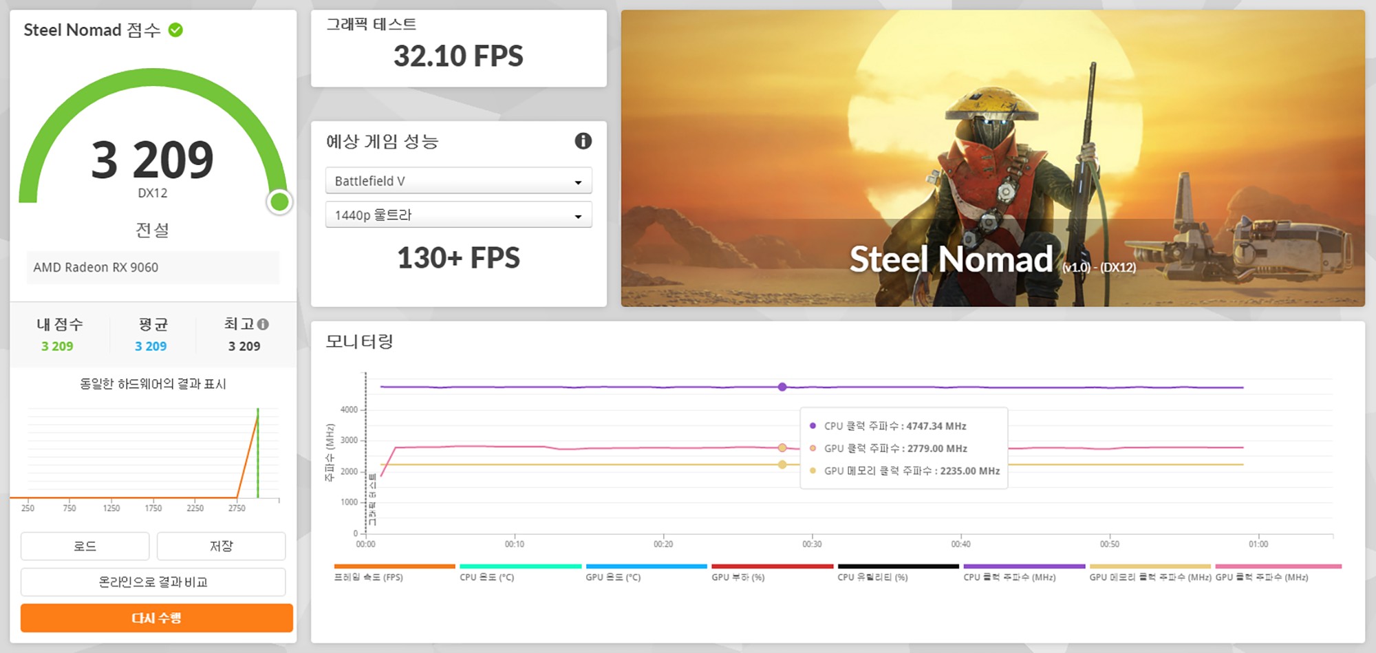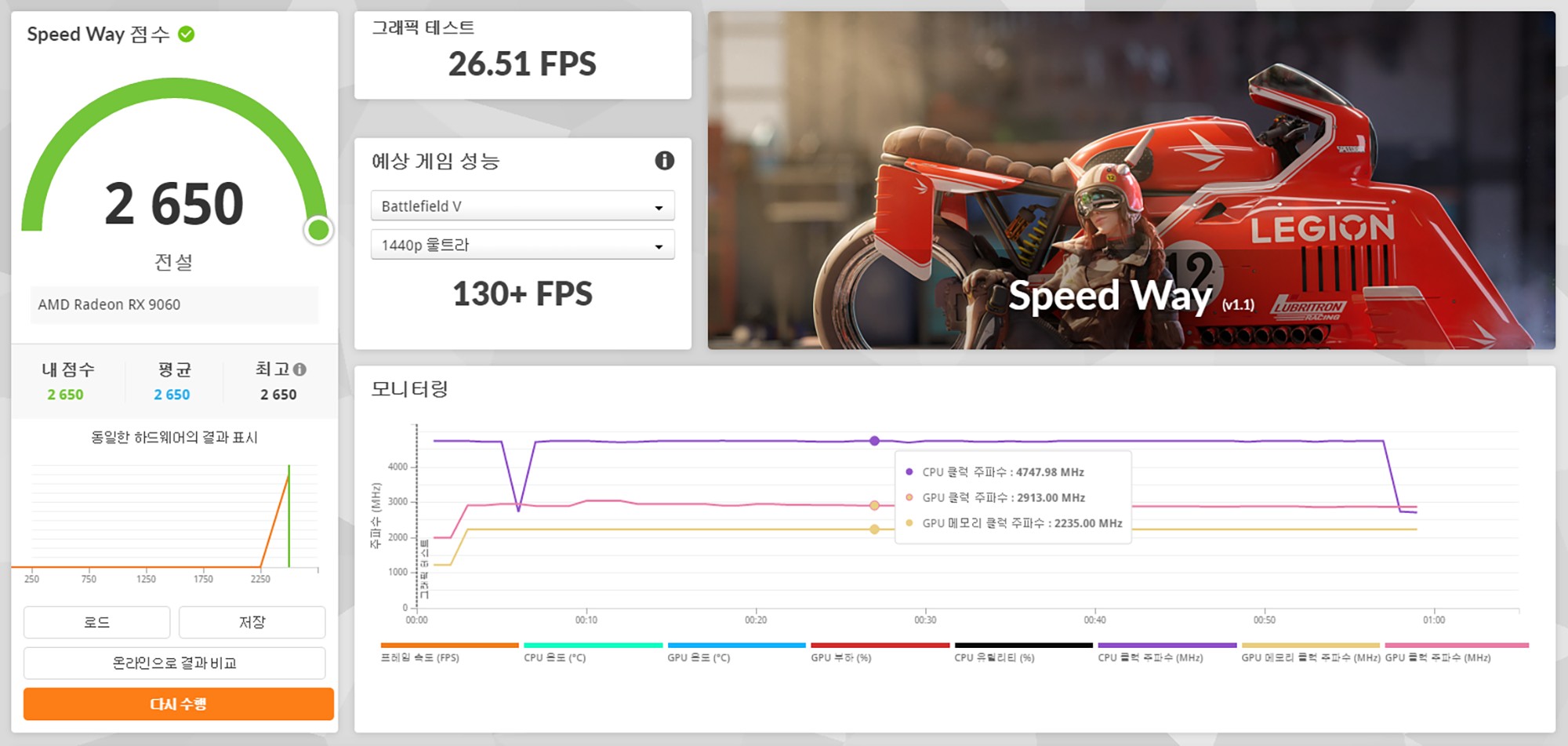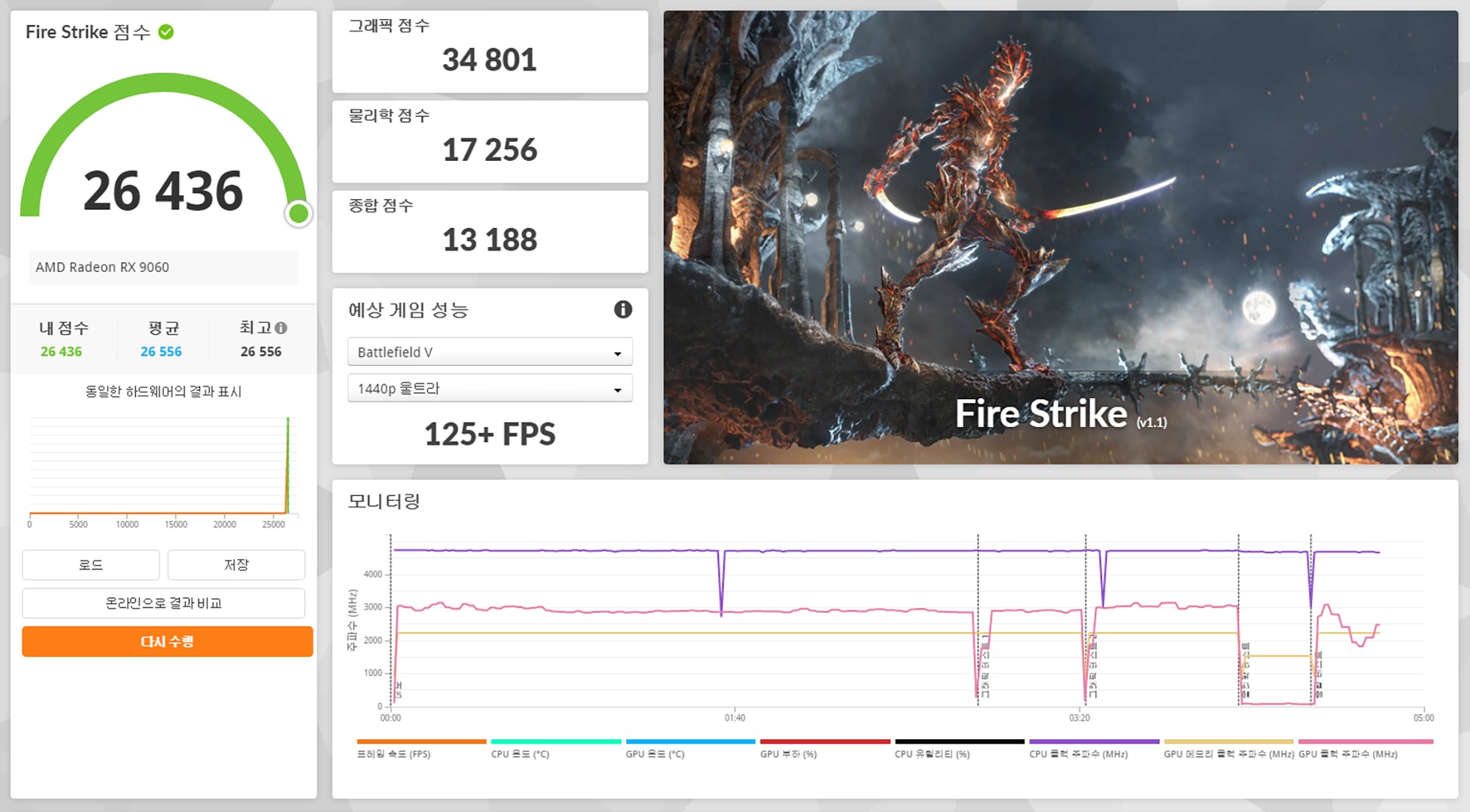 3DMARK를 이용해서 사파이어 라데온 RX 9060 PULSE 8GB 그래픽카드의 성능을 살펴보면 파이어 스트라이크(Fire Strike)는 26,436점, 타임 스파이(Time Spy)는 11,827점, 포트 로얄(Port Royal)은 8,401점, 스틸 노마드(Steel Nomad)는 3,209점, 스피드 웨이(Speed Way)는 2,650점입니다.