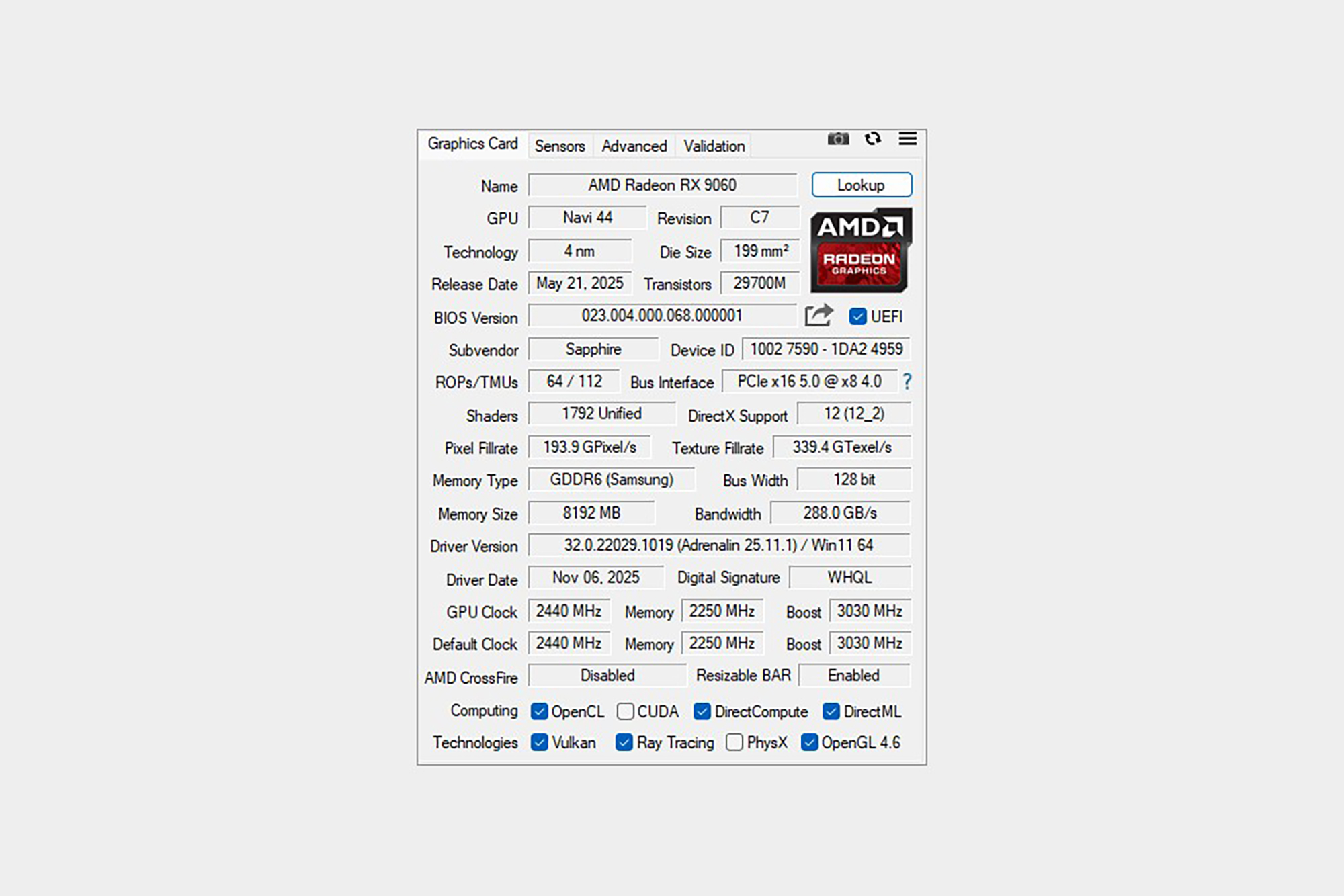 사파이어 라데온 RX 9060 PULSE 8GB 그래픽카드의 정보를 GPU-Z를 통해서 확인해 보면 1,792개의 스트림 프로세서를 탑재했고 게임 클럭은 2,440MHz 그리고 부스트 클럭은 3,040MHz입니다. 그 외에도 8GB 용량의 GDDR6 메모리를 탑재했는데요. 16GB 제품도 판매되고 있습니다.
