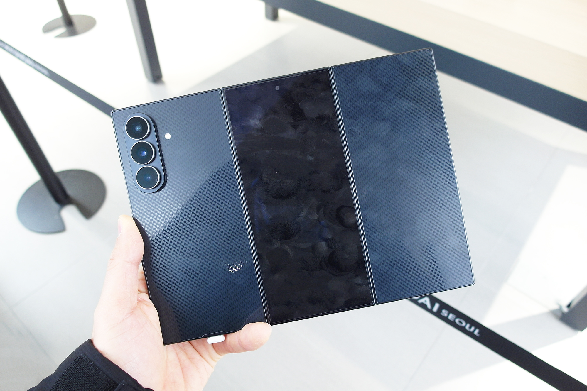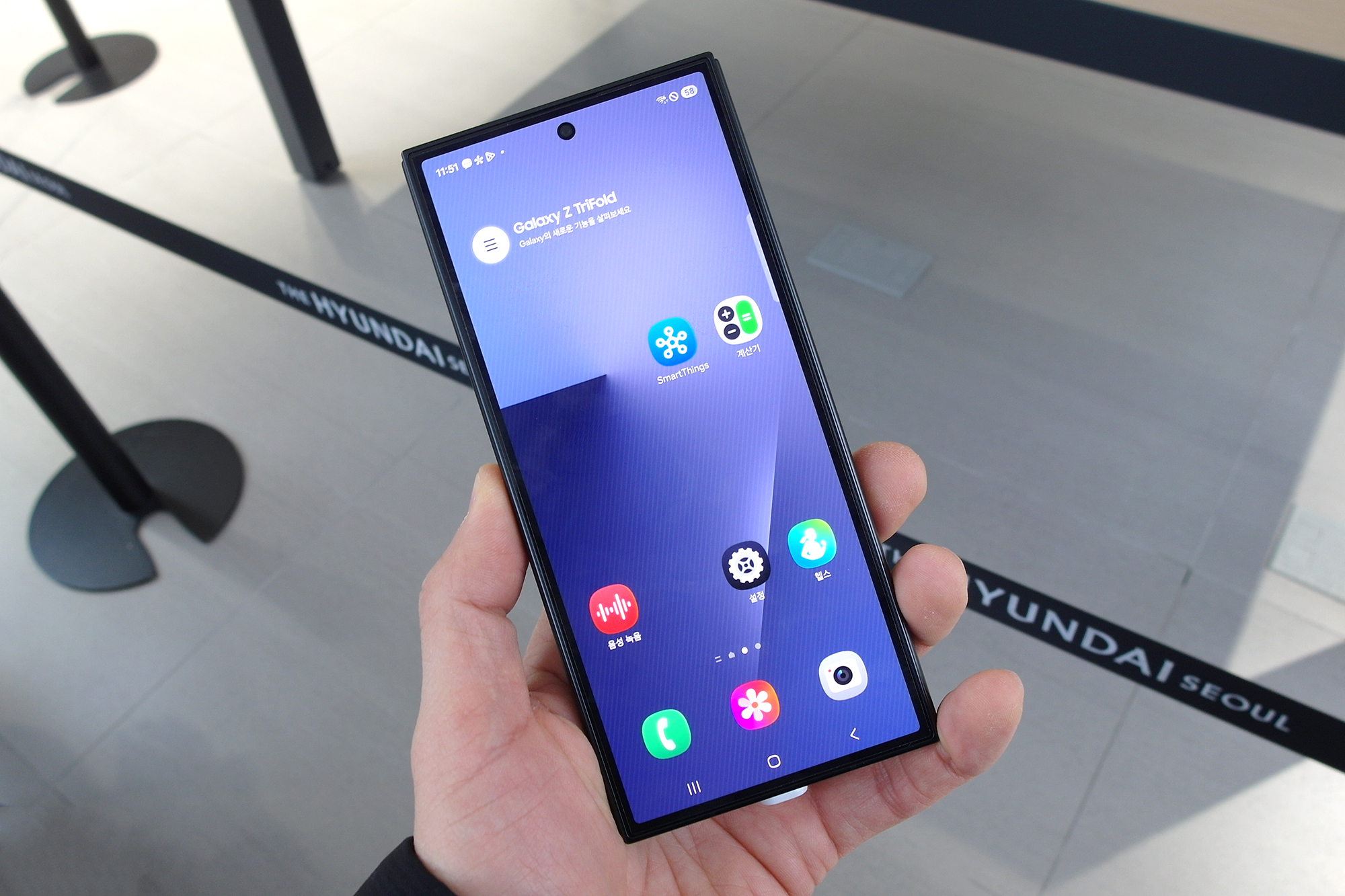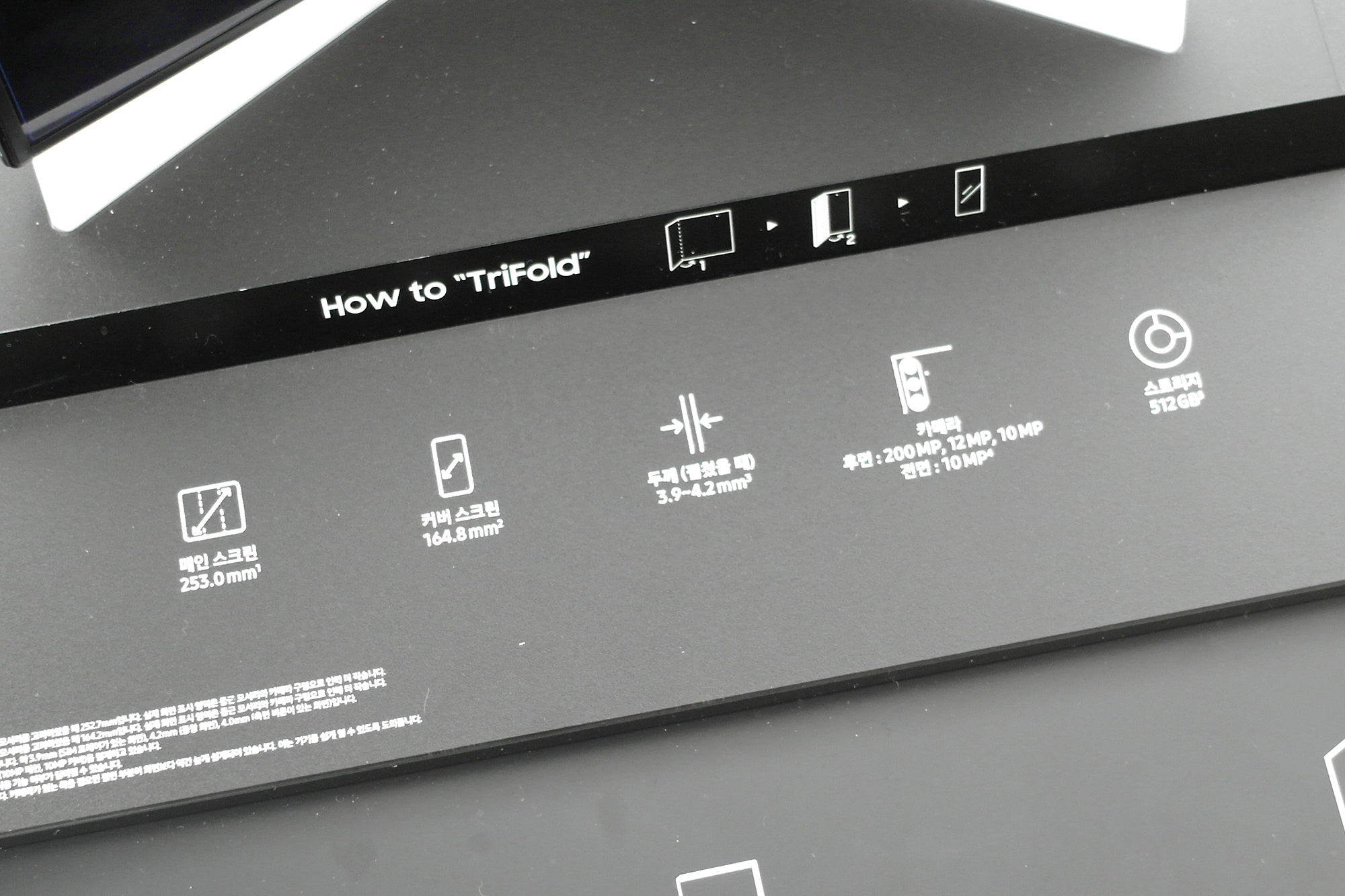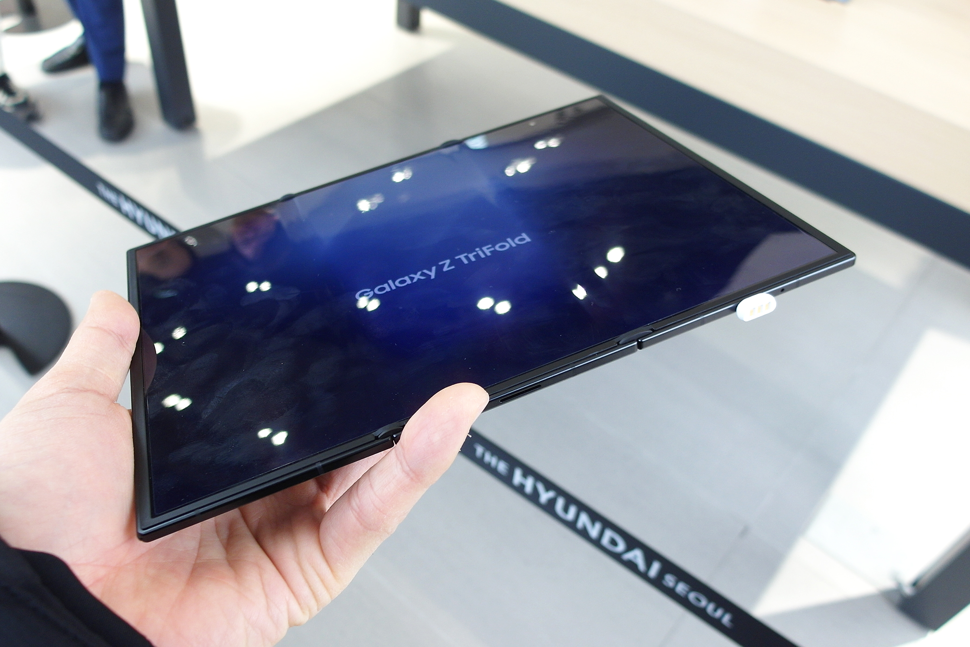 갤럭시 Z 트라이폴드의 전시 모습을 살펴보면 흡사 2개의 힌지가 프리스탑을 지원할 것처럼 구성되어 있는데요. 실제로는 다른 폴드 시리즈처럼 힌지의 각도를 조절할 수 있는 것은 아니고 펼치거나 접거나 두 가지 방식으로만 사용할 수 있습니다. 아무래도 두 번 접는 제품의 특성상 중간에 각도를 주는 것이 크게 효용이 없다고 판단한 것으로 보입니다.