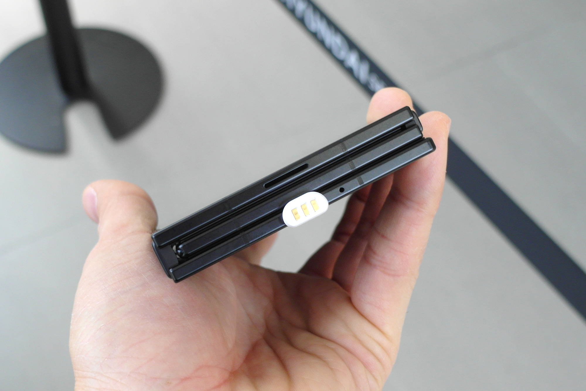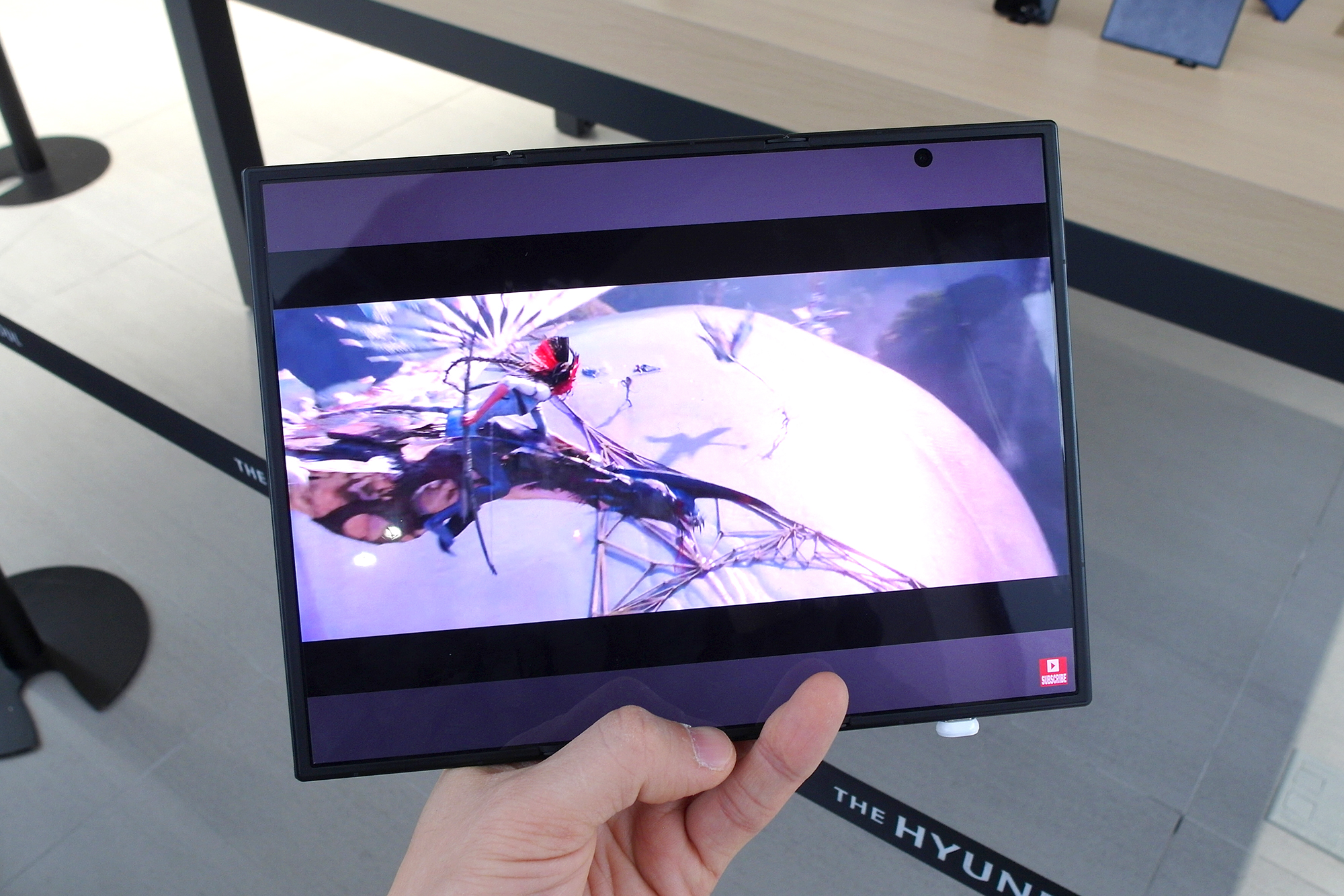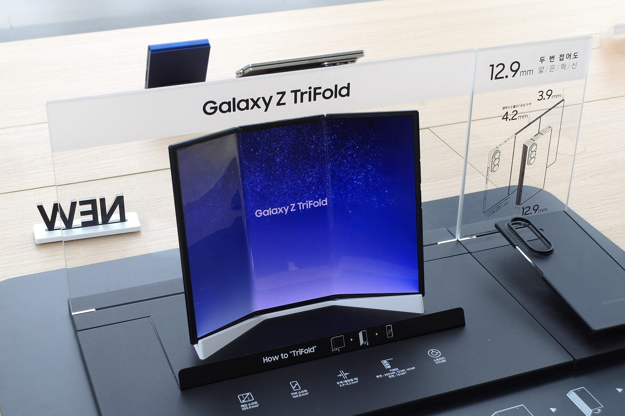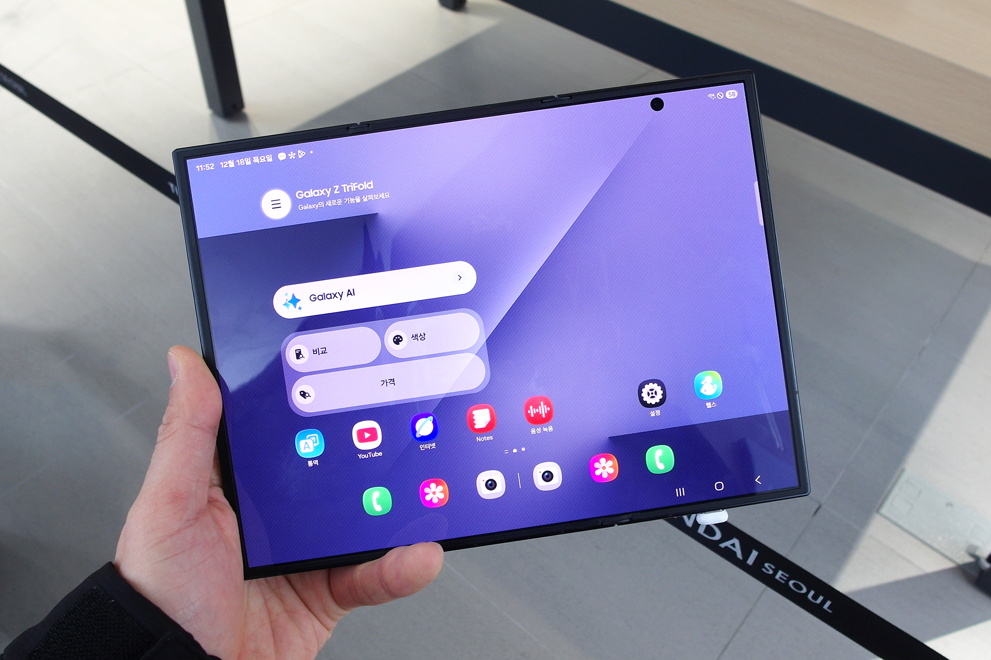갤럭시 Z 트라이폴드의 전시 모습을 살펴보면 흡사 2개의 힌지가 프리스탑을 지원할 것처럼 구성되어 있는데요. 실제로는 다른 폴드 시리즈처럼 힌지의 각도를 조절할 수 있는 것은 아니고 펼치거나 접거나 두 가지 방식으로만 사용할 수 있습니다. 아무래도 두 번 접는 제품의 특성상 중간에 각도를 주는 것이 크게 효용이 없다고 판단한 것으로 보입니다.