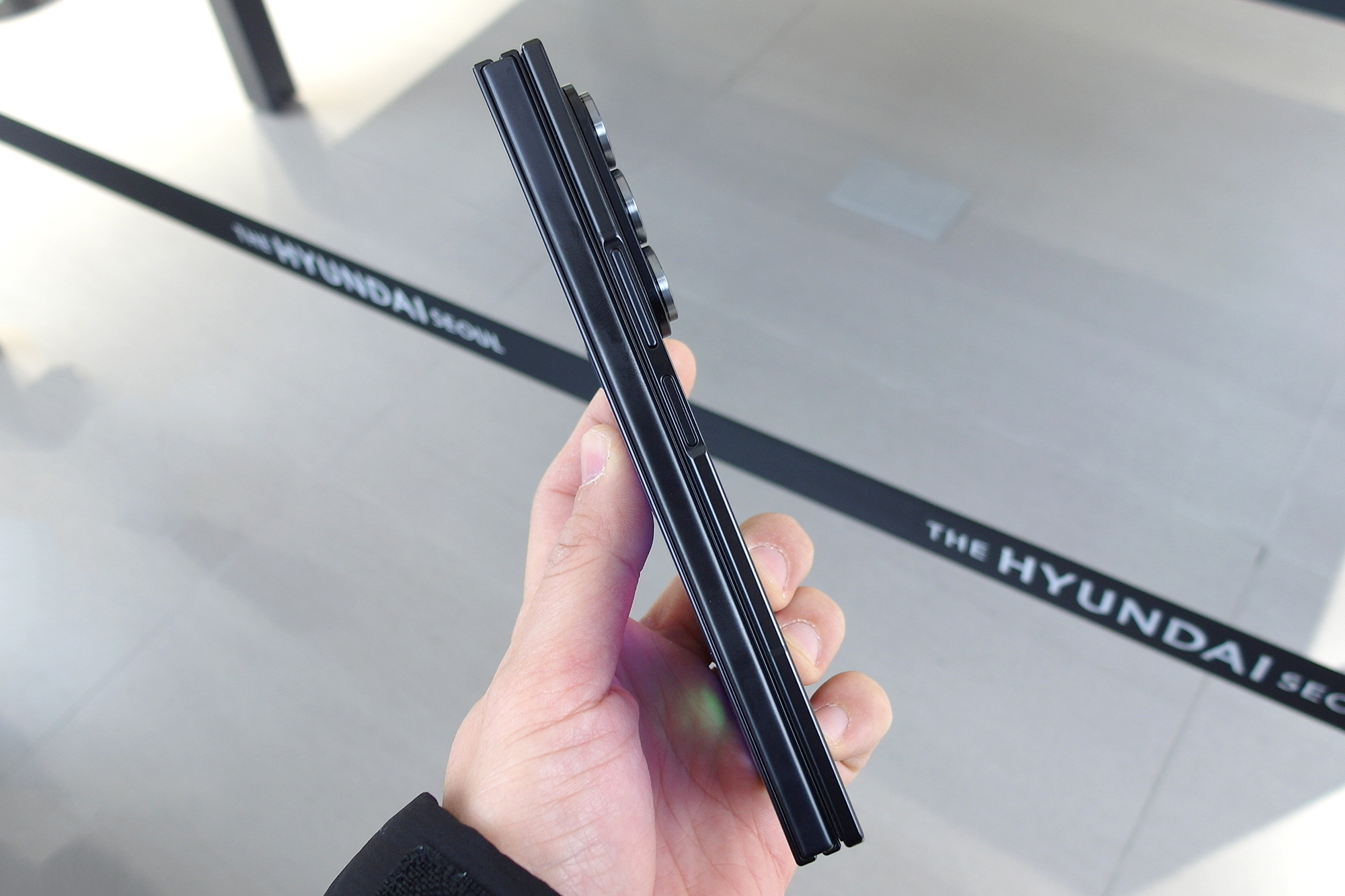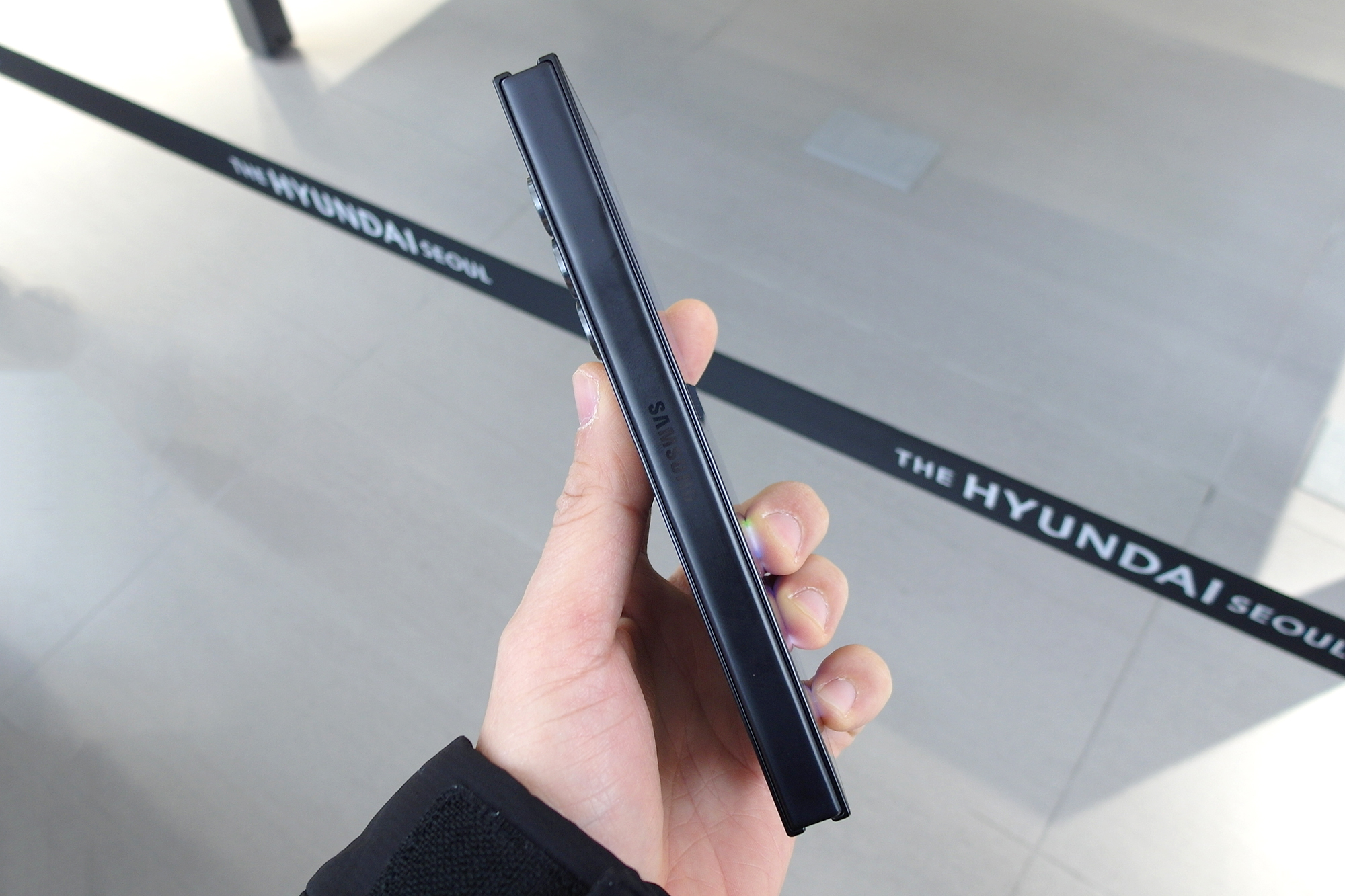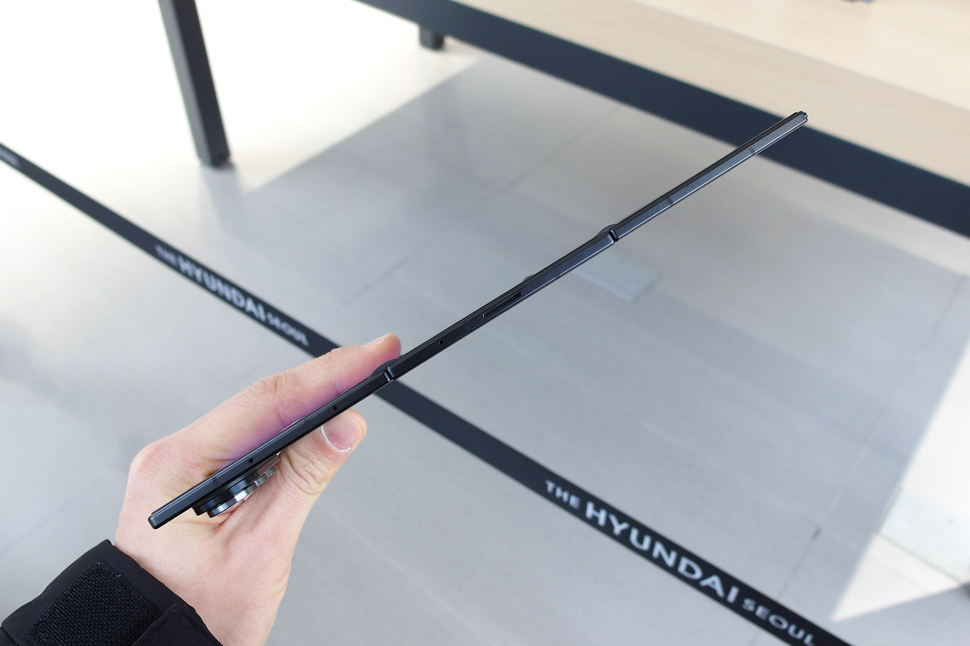 갤럭시 Z 트라이폴드를 펼친 상태에서도 두께를 살펴보면 카메라 섬 부분은 4mm, 중간은 4.2mm 그리고 가장 오른쪽은 3,9mm로 제작되었습니다. 미세하지만 단차가 존재하고 예민한 분들은 이러한 부분이 약간 거슬릴 수 있을 것으로 예상합니다.