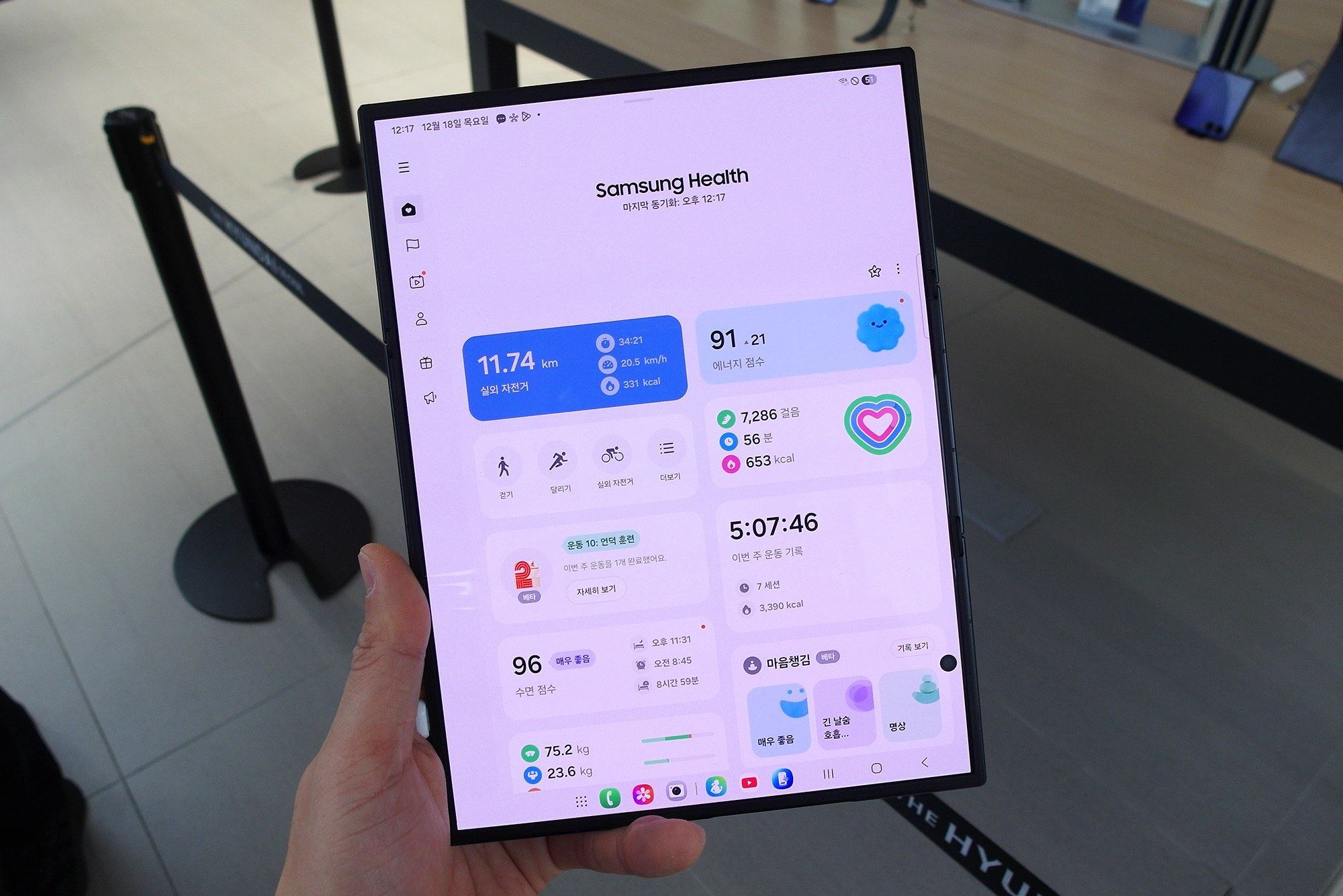 갤럭시 Z 트라이폴드를 가로나 세로로 들면 전달되는 데이터양이 엄청나다는 것을 확인할 수 있습니다. 그런데 반대로 지하철이나 버스에서 펼쳐서 동영상을 감상하거나 카톡을 하면 옆 사람들에게 그대로 노출될 가능성이 큰 편입니다. 그래서 실외에서 사용하기에는 약간 불편한 부분이 있습니다.