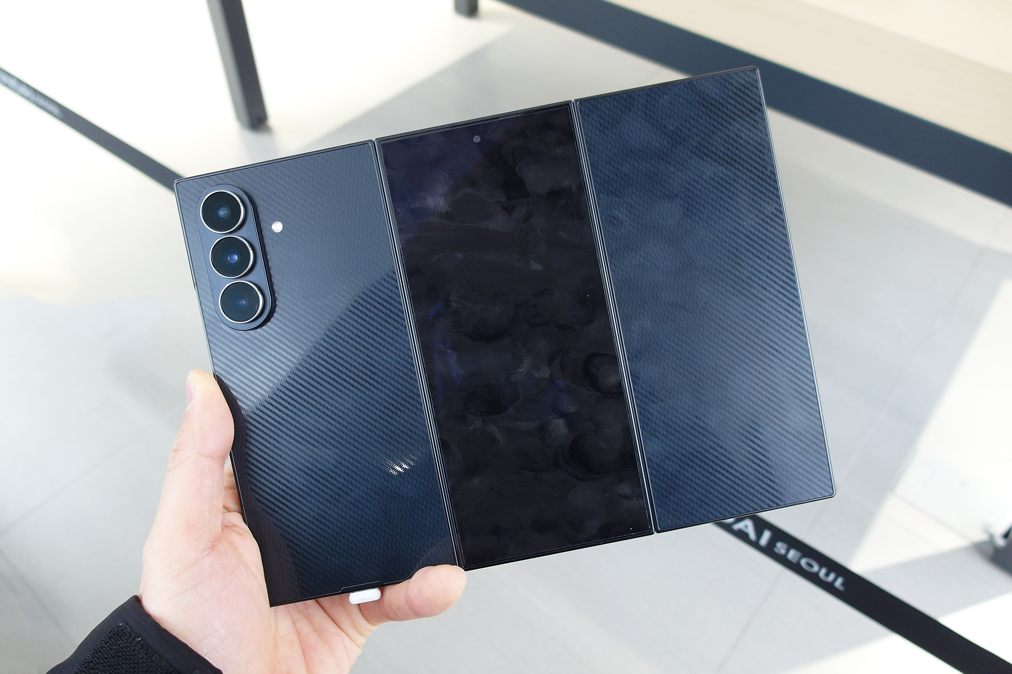 갤럭시 Z 트라이폴드는 크래프티드 블랙 단일 컬러로 출시되었는데요. 폴드7과의 차별성을 위해서 그랬지만 양쪽이 유광으로 마무리되었고 사선이 들어가 있습니다. 전체저으로 올드한 느낌을 주는 편이고 폴드7처럼 무광으로 마무리했다면 더욱 깔끔했을 것 같습니다. 그렇지만 디자인이라는 것이 개인의 취향을 반영하는 것이기 때문에 만족하시는 분들도 있을 것으로 보입니다.