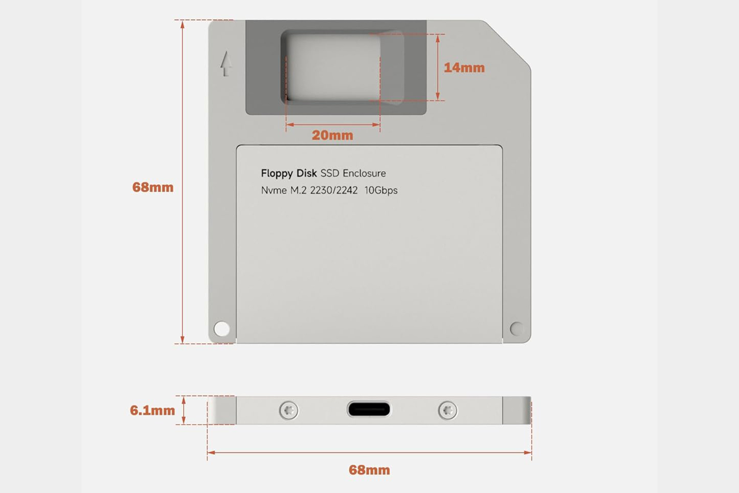 하기비스 외장 SSD 케이스의 디자인은 플로피 디스켓 스타일로 제작되었습니다. 저와 같은 아재들에게는 감성을 자극한다고 할 수 있습니다. 두께는 6.1mm이고 무게는 53g으로 가벼운 편입니다. 전체적인 크기는 비슷한 규격의 제품과 비교해서 작다고 이야기하기는 어려울 것으로 예상합니다.