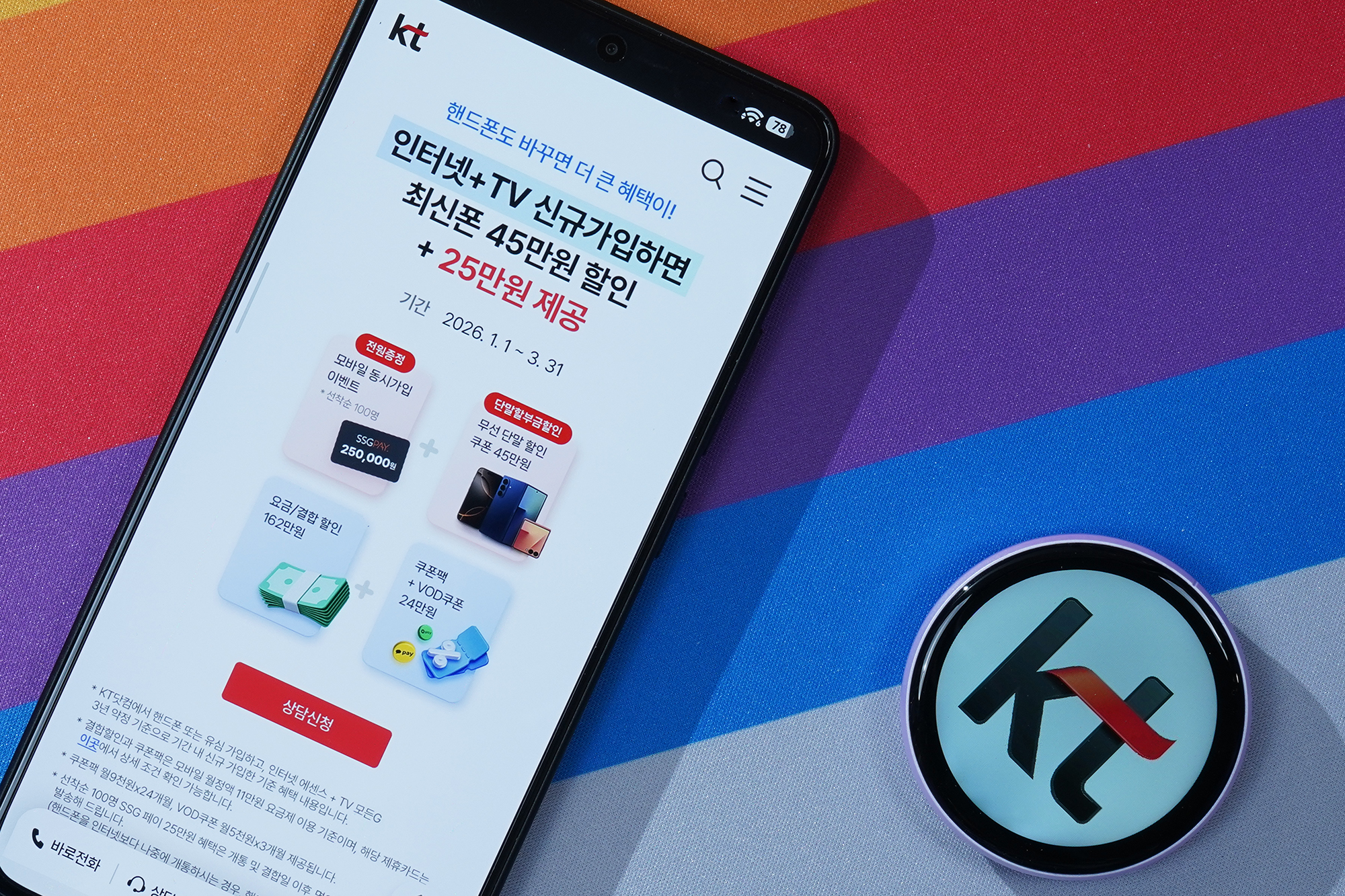 만약 핸드폰 교체 계획이 있는 분들이라면 인터넷 + TV 신규 가입하면 SSG 페이 250,000원과 무선 단말 할인 쿠폰 45만원권이 제공됩니다. 조금 더 저렴하게 스마트폰을 교체하고 싶으신 분들은 관련 내용을 한 번 확인해 보시길 바랍니다.