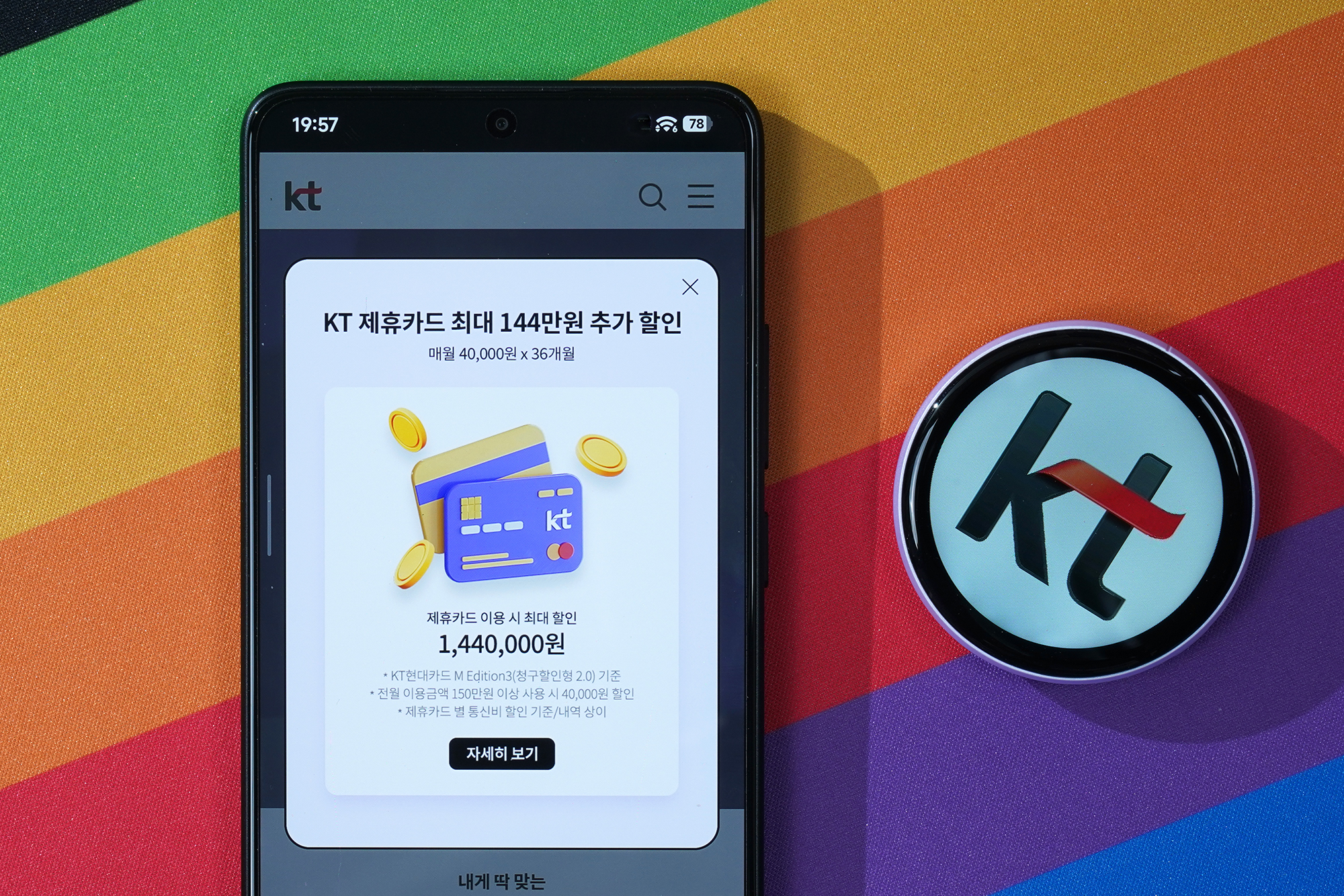 마지막 혜택은 제휴카드 할인데요. KT 현대카드M Edition3 기준으로 전원 이용 금액이 150만원 이상이면 36개월 동안 매월 40,000원 할인 혜택이 제공됩니다. 약 2.66%의 캐시백이라고 생각하면 좋은데요. 주력 카드로 사용하신다면 메리트가 있다고 할 수 있습니다.