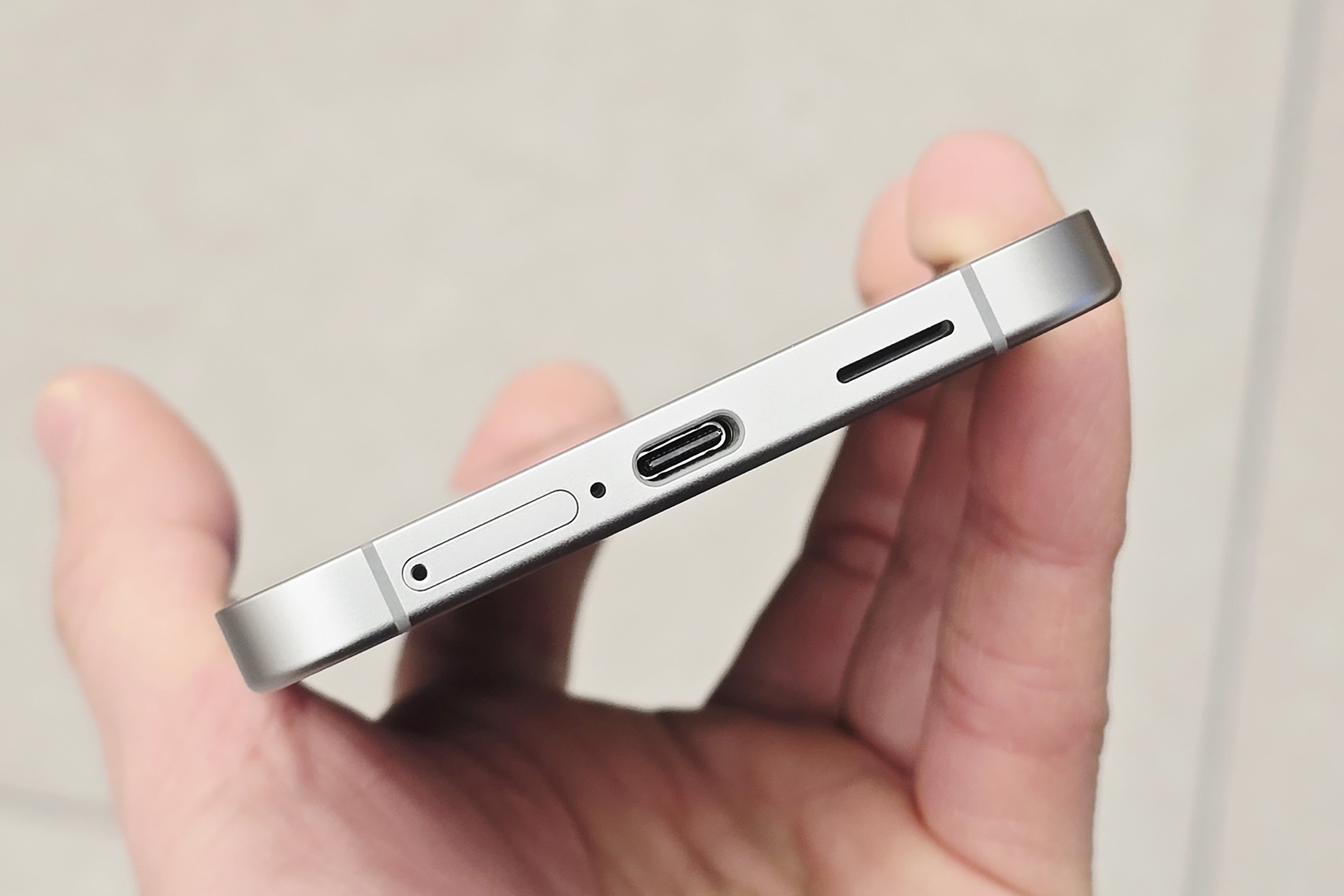 갤럭시 S25 FE의 테두리 부분은 깔끔한 느낌의 메탈로 마무리되었습니다. 그리고 아래쪽에 배치된 USB-C 포트는 USB 3.2 Gen1을 지원해서 빠른 속도로 데이터를 전송할 수 있습니다.