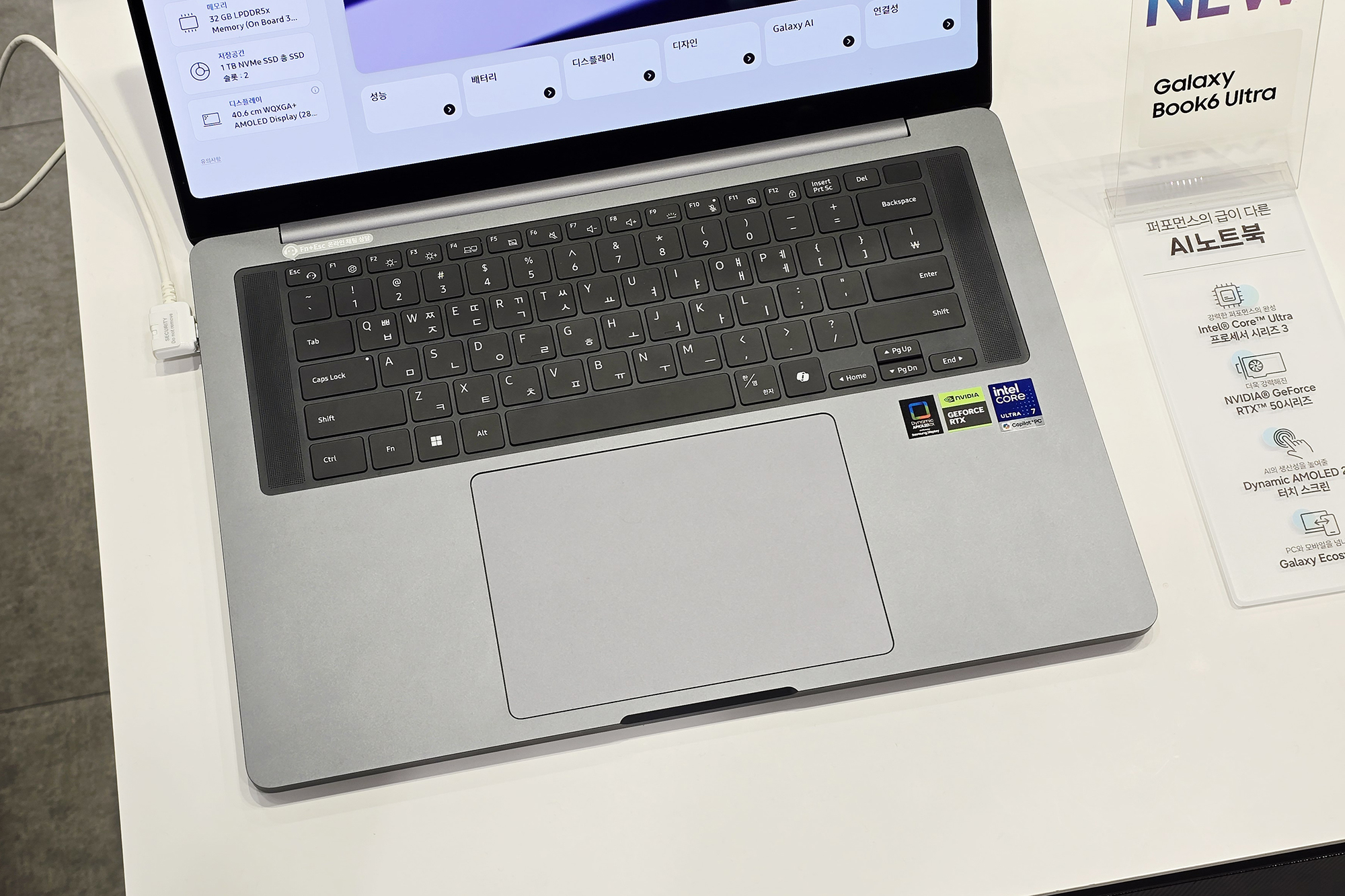 갤럭시북6 울트라의 키보드를 살펴보면 투톤으로 디자인된 것을 확인할 수 있습니다. 이전 세대의 제품의 경우에는 팜레스트와 키보드 주변까지 색상이 동일했지만 최신 제품의 경우에는 애플의 맥북처럼 키보드 주변은 블랙으로 처리되었는데요. 저는 오히려 깔끔한 느낌을 주는 편이라고 생각되었습니다.