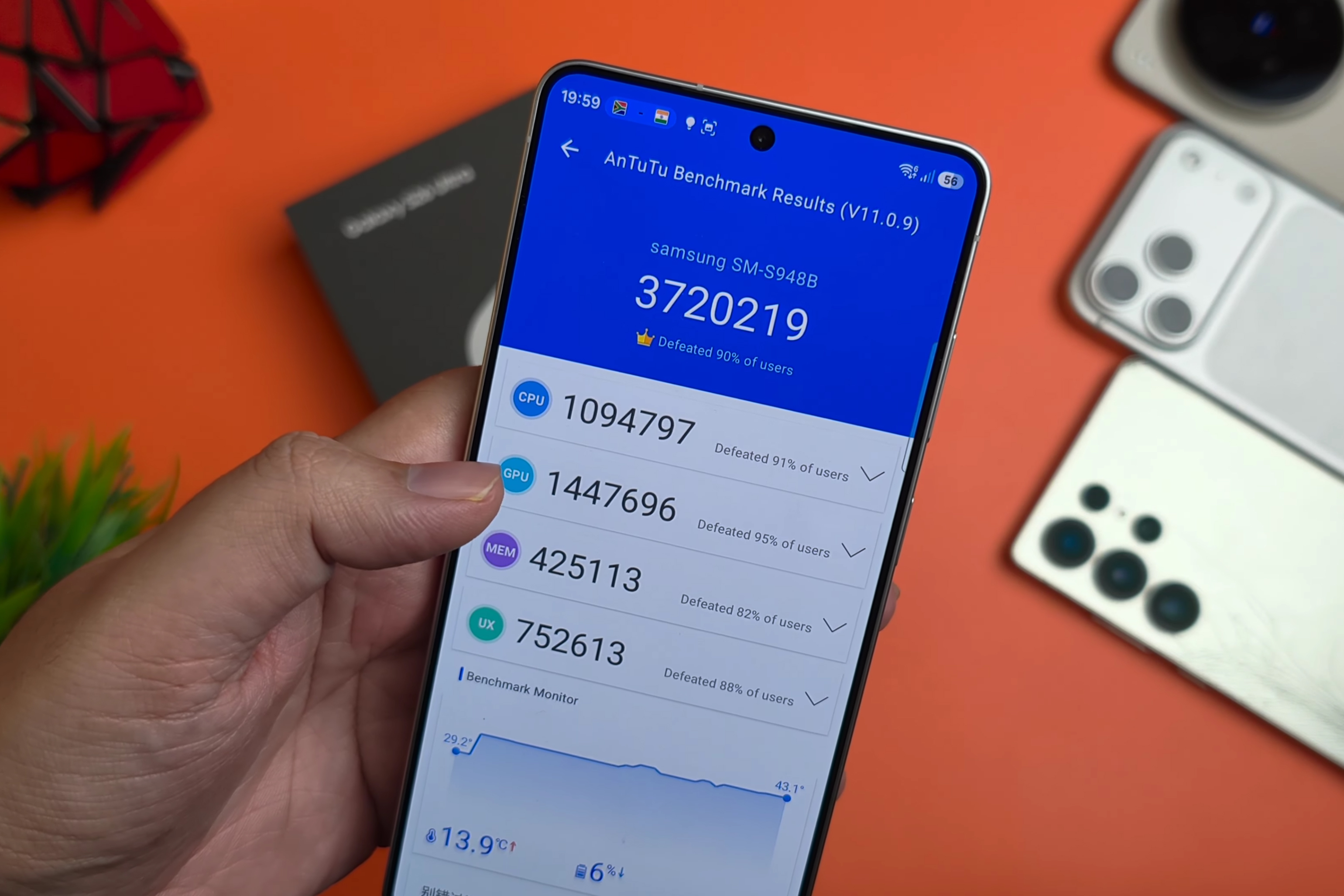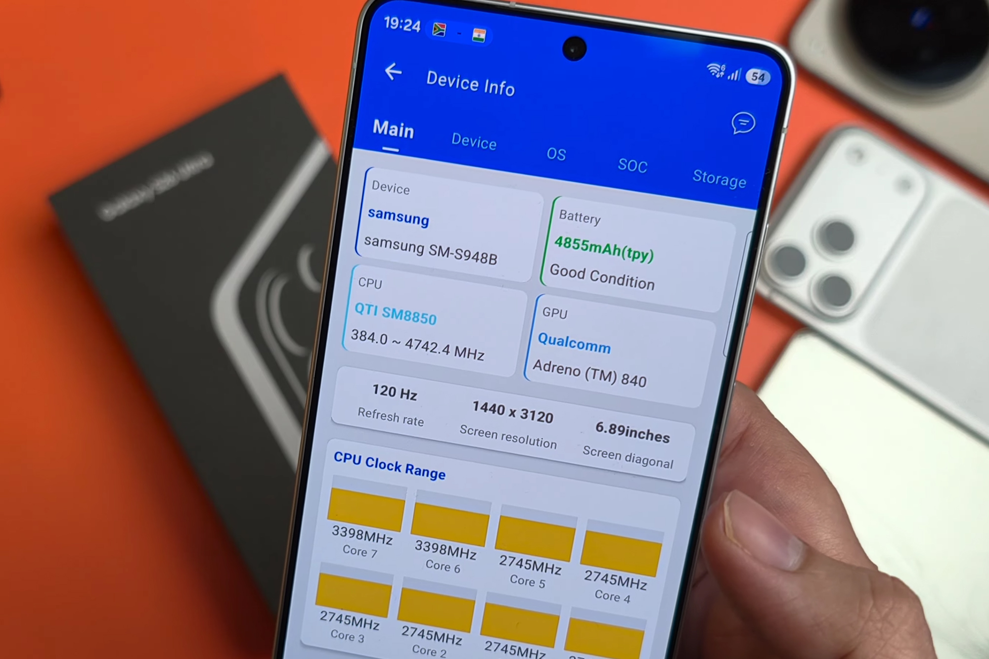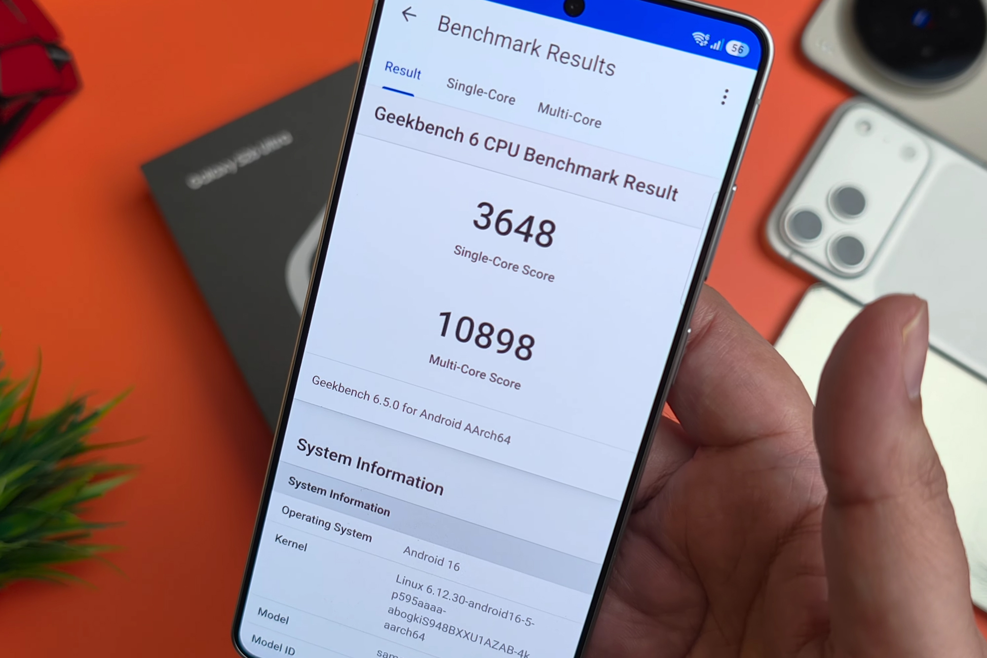 갤럭시 S26 울트라의 모델 번호는 SM-S948B이고 퀄컴 스냅드래곤8 엘리트 5세대 프로세서가 탑재되었습니다. 그리고 아쉽게도 배터리의 용량은 몇 년째 같은 5,000mAh입니다. 벤치 마크를 통해서 성능을 살펴보면 긱벤치6 싱글 코어는 3,648점, 멀티 코어는 10,898점으로 측정되었습니다. 그리고 안투투 점수는 3,780,219점입니다.