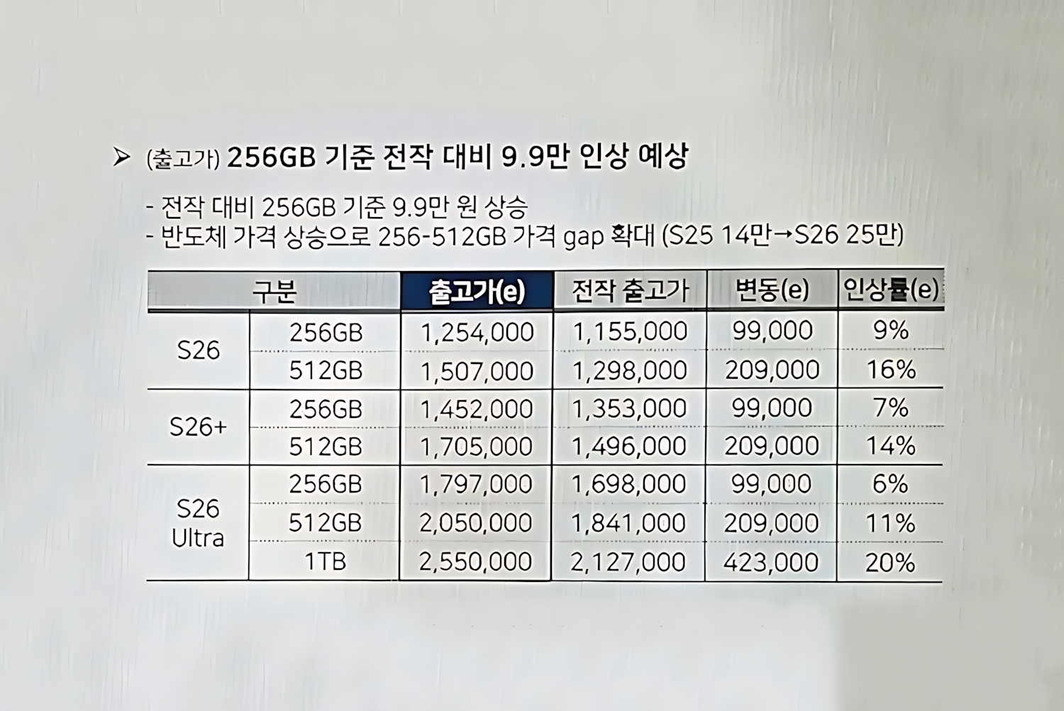 S26(256GB) : 1,254,000원(출고가) - 99,000원(9%) 인상