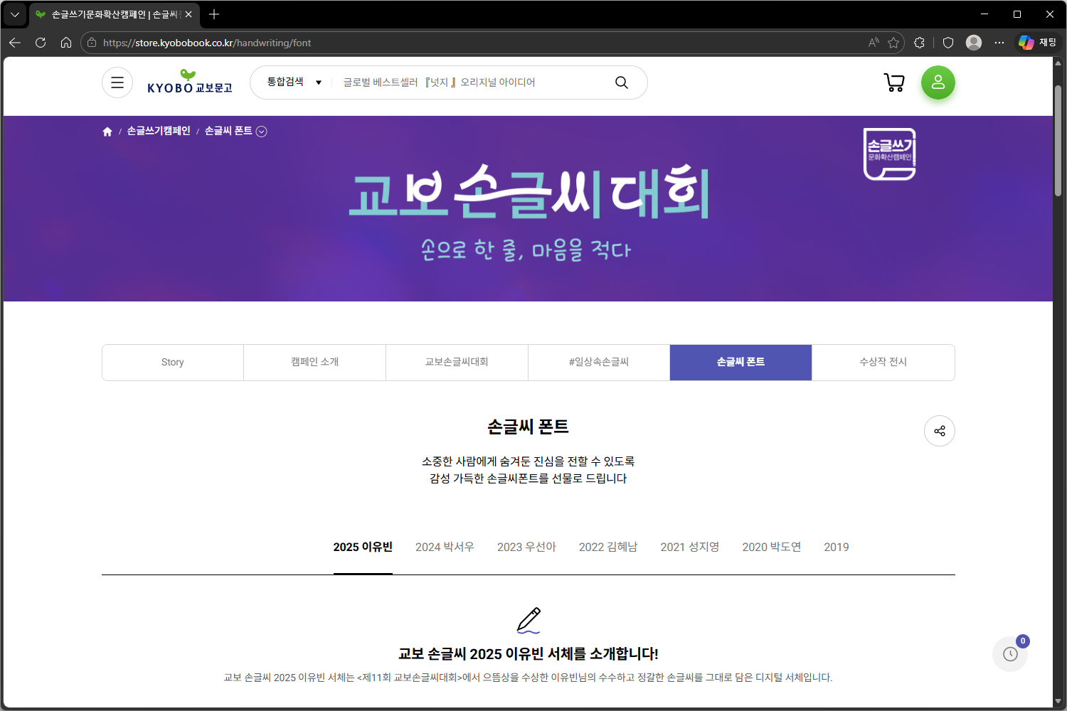 교보문고에서 제공하는 손글쓰기문화확산캠페인은 글을 읽고 쓰면서 "손글씨"의 가치를 체험할 수 있도록 책 속 문장을 적는 손글씨 공모전으로 수장작의 손글씨를 폰트(디지털 서체)로 만들어