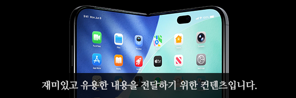 아이폰 폴드의 루머는 상당히 구체적인 편인데요. 이미 애플에서는 오래전부터 폴더블 스마트폰을 준비해 왔지만, 주름과 같은 관련 기술이 아직 성숙하지 않았다고 판단했고 이제는 어느 정도 해결했다고 생각하고 있는 것으로 보입니다. 특히 다른 폴더블 스마트폰과는 다르게 와이드 형태의 제품을 준비하고 있다는 점이 차별화된 특징이고 과연 어느 정도의 완성도를 보여줄지 기대되었습니다. 그럼 다음 소식에서 조금 더 자세한 내용을 확인해 보도록 하겠습니다.