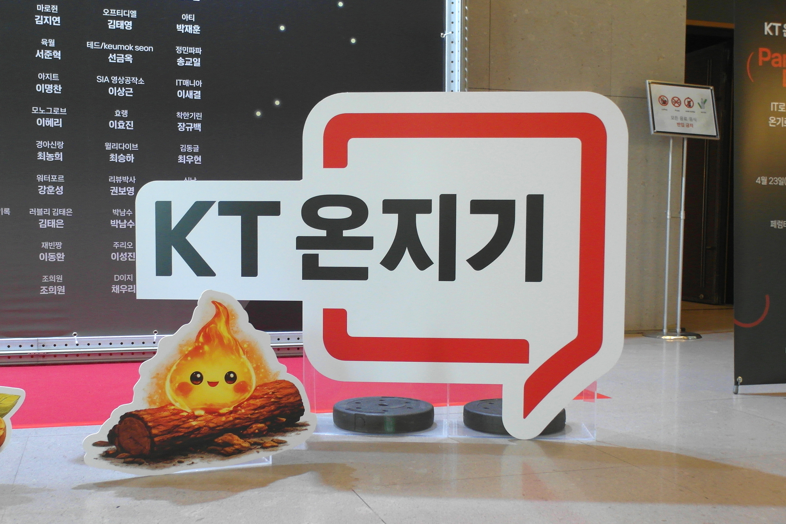 3층 행사장의 앞에는 KT 온지기 2기에 참여한 총 100여 명의 블로거 혹은 유튜버 창작자들의 이름이 인쇄되어 있었는데요. 규모 면에서는 국내 최대 규모라고 할 수 있습니다. 그리고 불꽃을 형상화한 로고도 귀여웠는데요. 내부 등급이 불씨, 온기, 열기, 활기로 구성되어 있습니다.