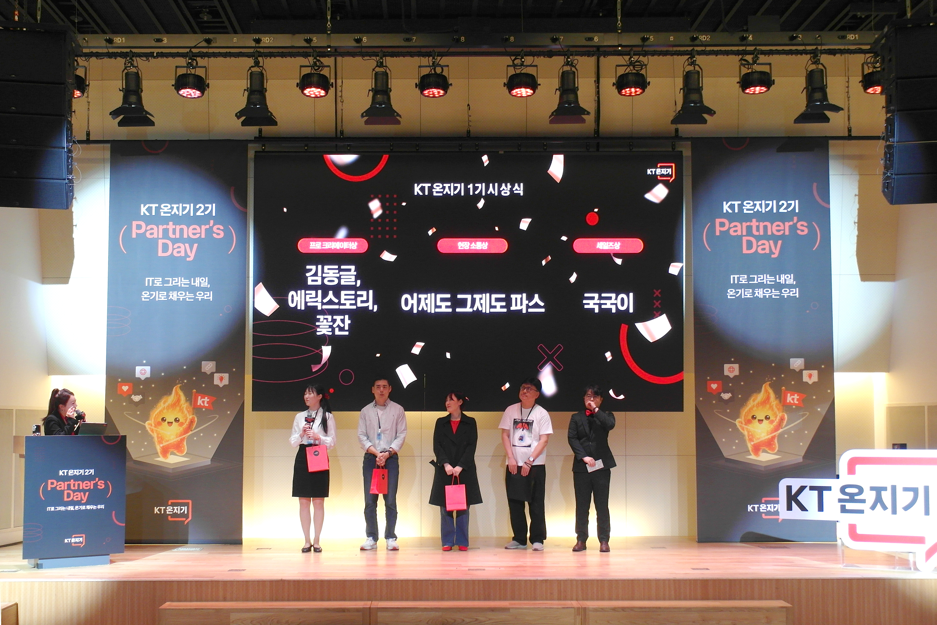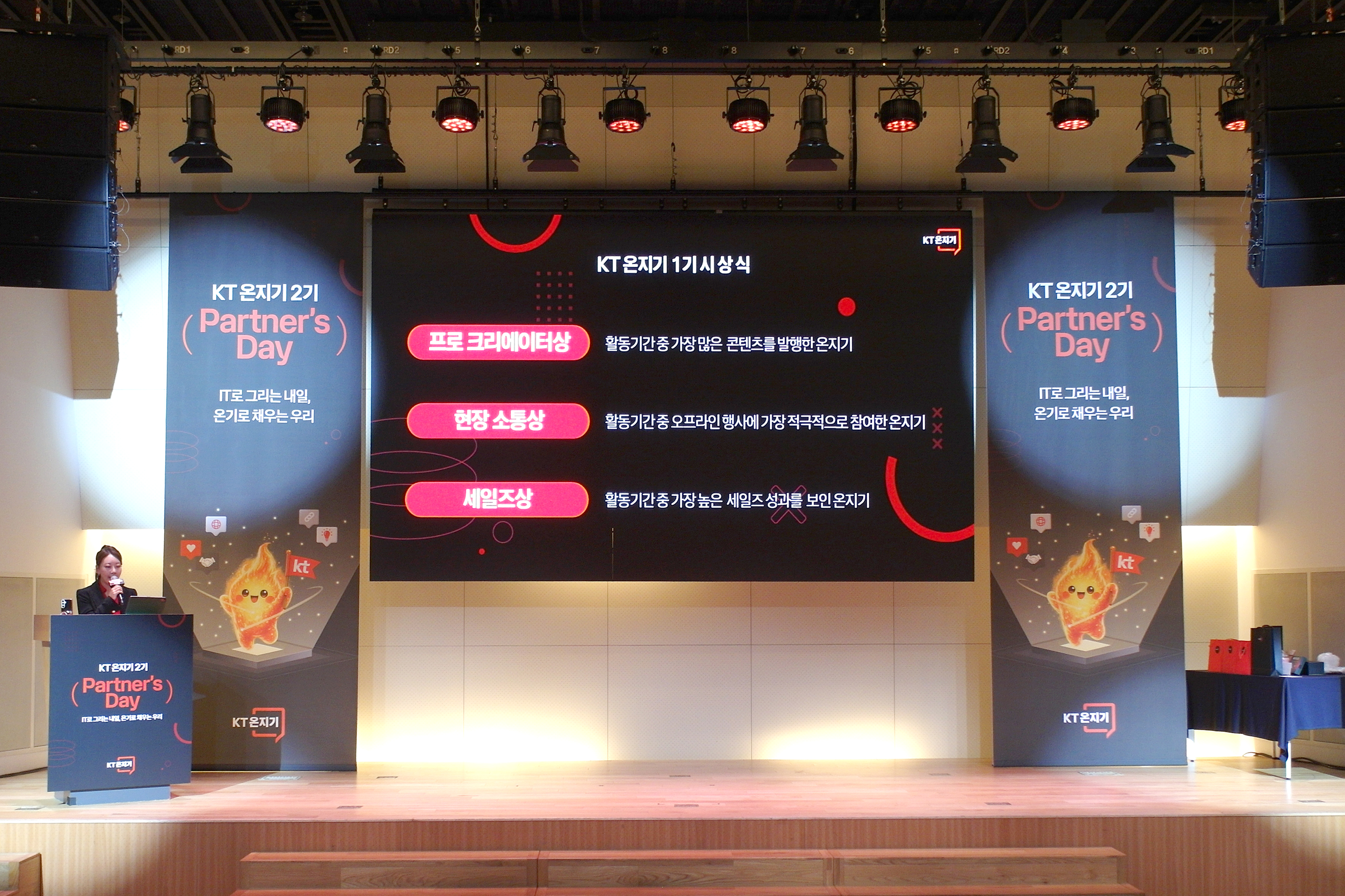 환영사 후에는 KT 온지기 1기 시상식이 진행되었는데요. 가장 많은 콘텐츠 발행이나 가장 활발한 오프라인 행사 참여 그리고 가장 높은 세일즈 성과를 보인 총 5분으로 구성되어 있었고 다양한 사은품이 제공되었습니다.