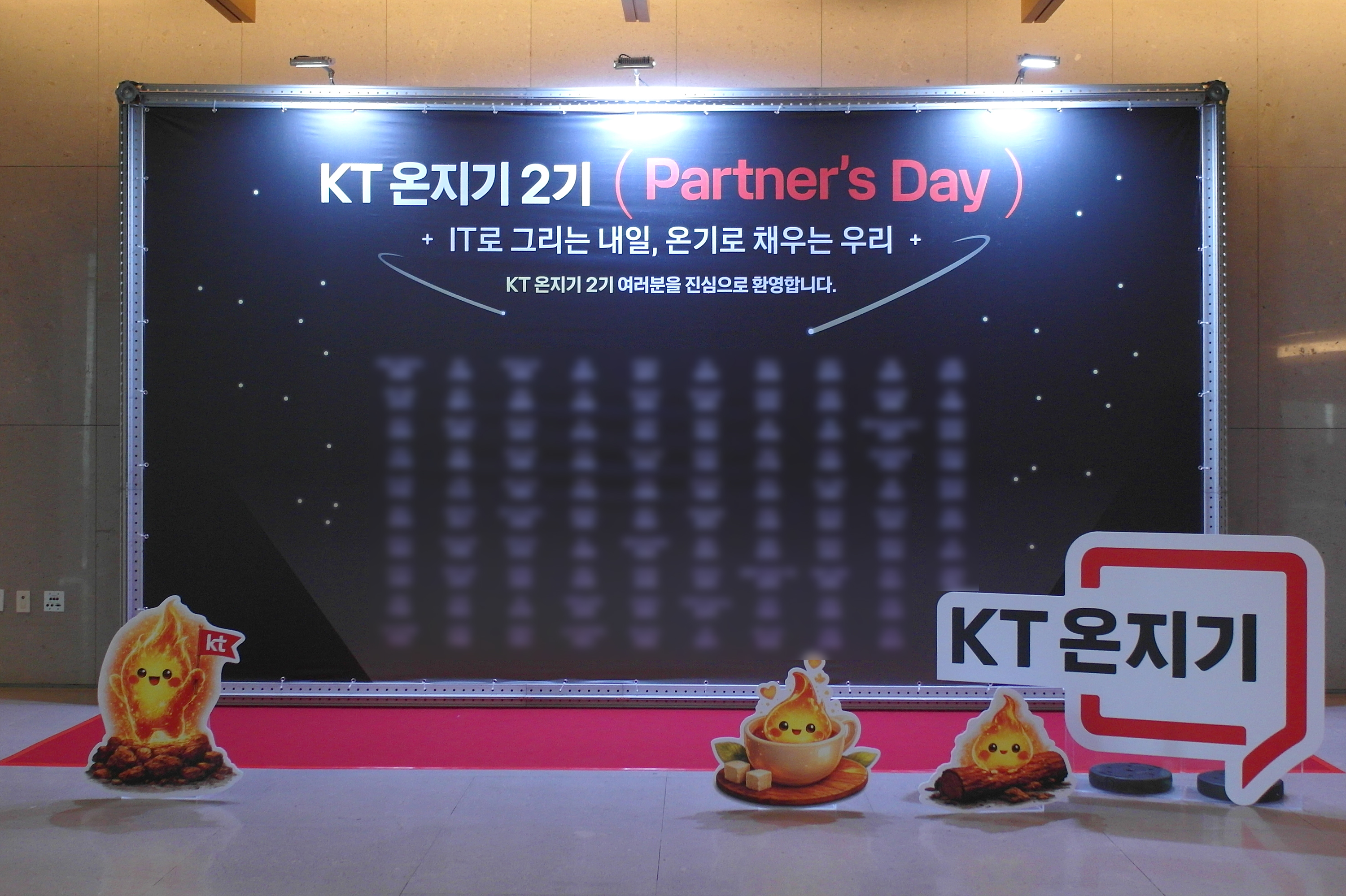 3층 행사장의 앞에는 KT 온지기 2기에 참여한 총 100여 명의 블로거 혹은 유튜버 창작자들의 이름이 인쇄되어 있었는데요. 규모 면에서는 국내 최대 규모라고 할 수 있습니다. 그리고 불꽃을 형상화한 로고도 귀여웠는데요. 내부 등급이 불씨, 온기, 열기, 활기로 구성되어 있습니다.