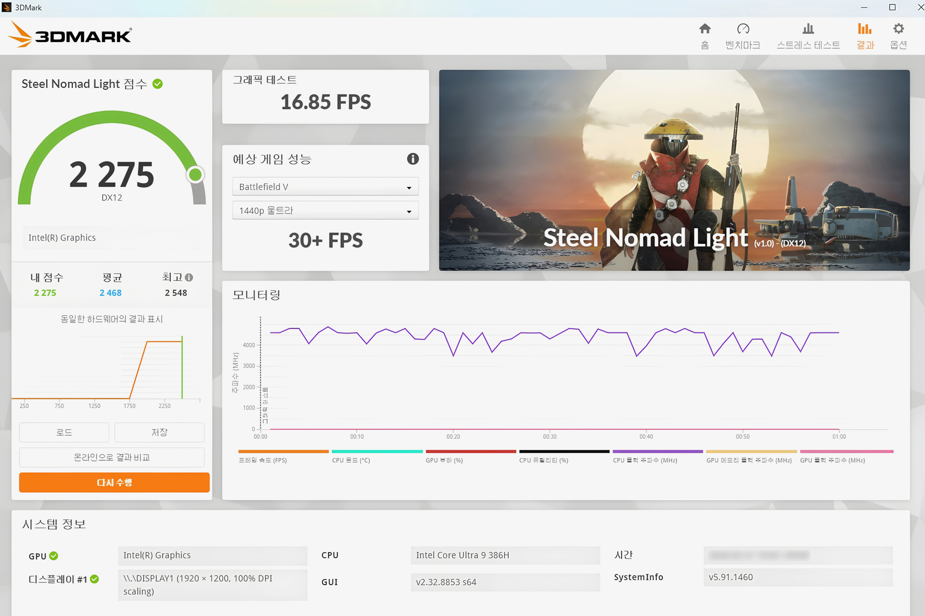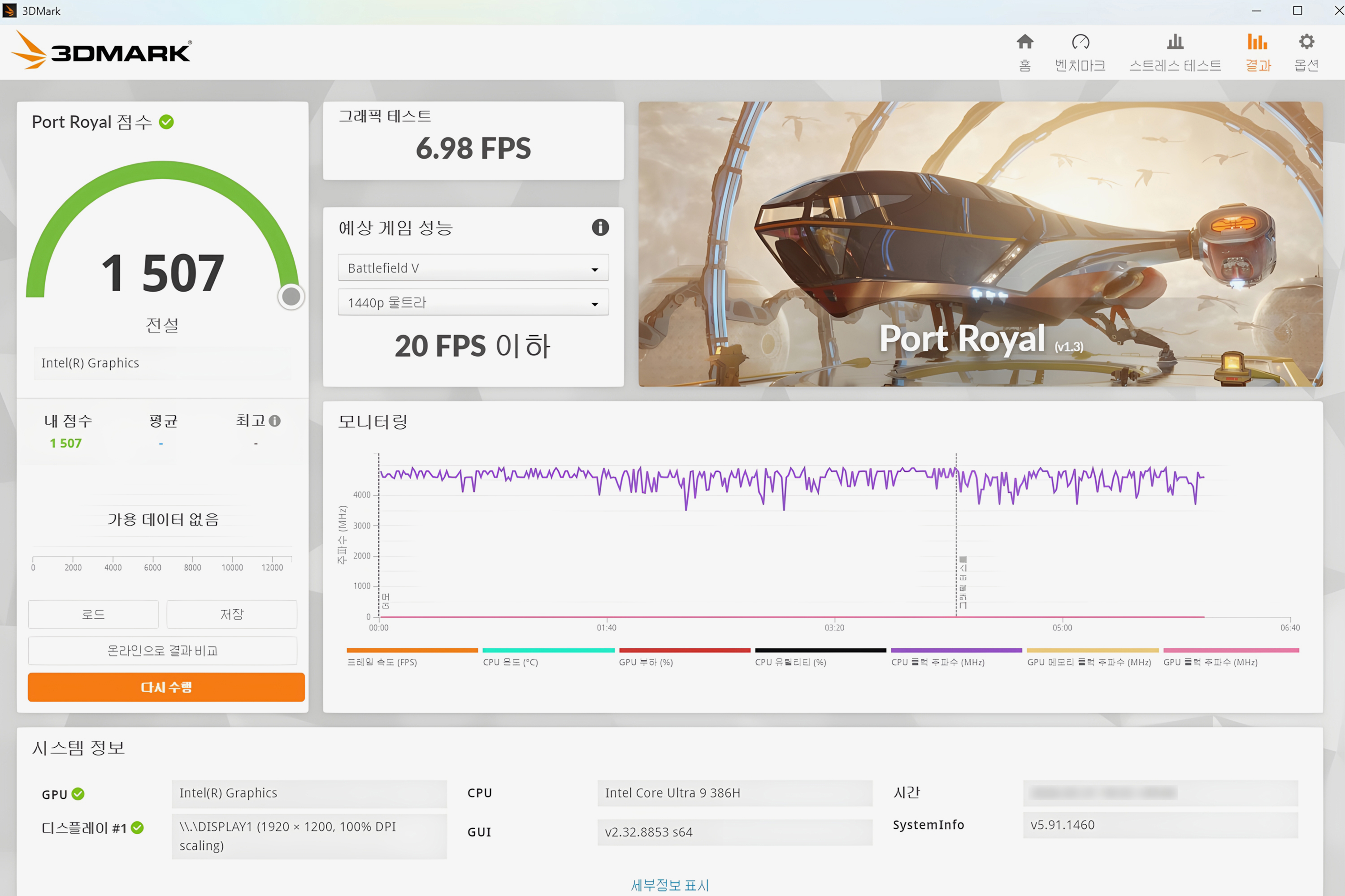 그래픽카드의 성능을 확인하는 용도로 사용하는 3DMARK 벤치마크를 이용해서 GPU의 성능을 확인해 보면 파이어 스트라이크(Fire Strike)는 6,581점, 타임 스파이(Time Spy)는 3,312점, 포트 로얄(Port Royal)은 1,507점, 스틸 노마드 라이트(Steel Nomad Light)는 2,275점으로 측정되었습니다.