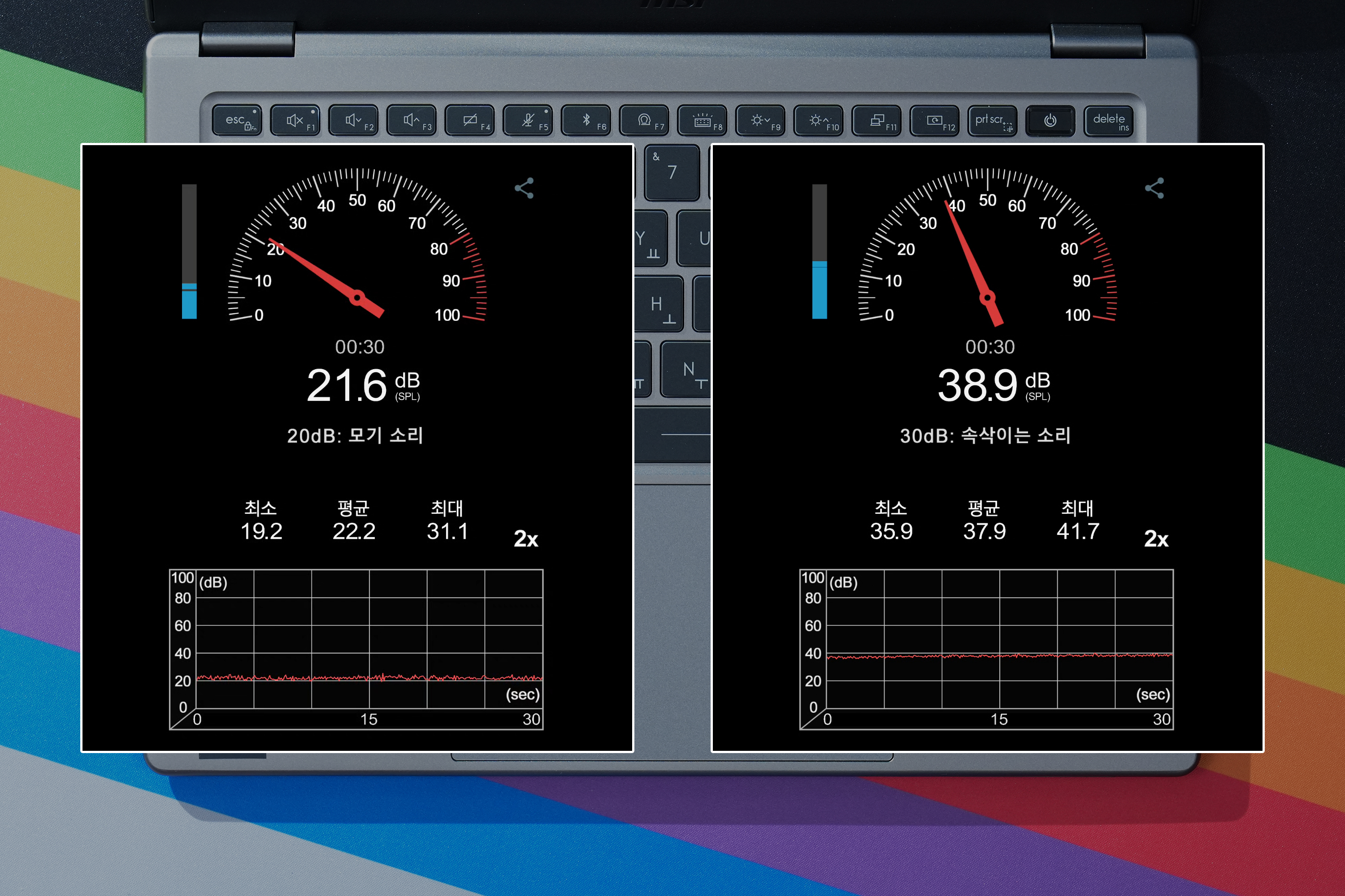 소음의 경우에는 키보드 위 20cm 지점에서 스마트폰의 마이크 방향을 아래쪽으로 향한 상태에서 측정을 진행했는데요. 대기 상태에서는 평균 22.2dB로 측정되었고 최대로 쿨러가 동작하는 상태에서는 평균 37.9dB로 측정되었습니다. 크게 신경이 쓰일 것 같지는 않습니다.