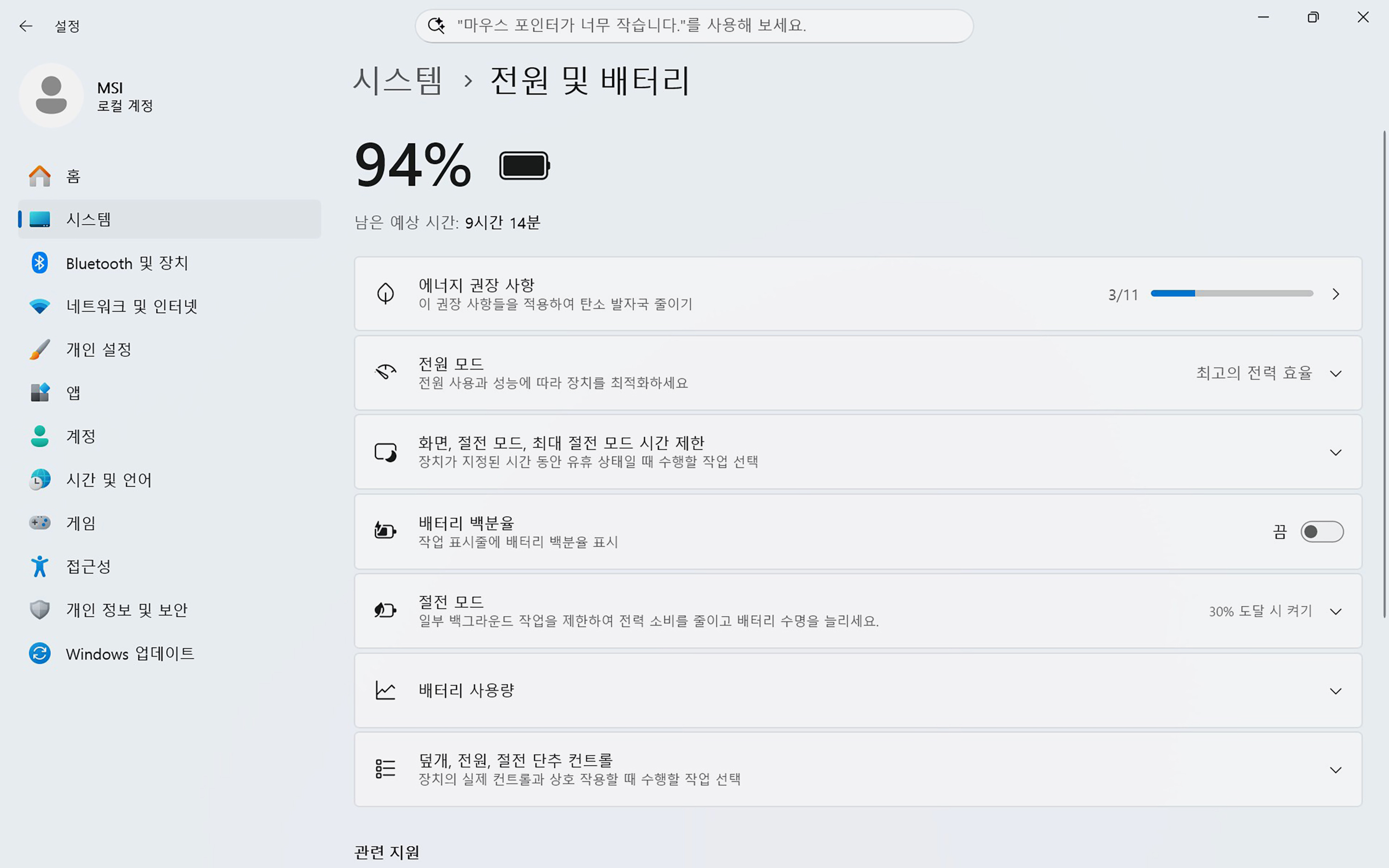MSI 프레스티지 14 AI+ 노트북에 탑재된 OLED 디스플레이는 뛰어난 화질을 제공하는데요. 특히 리얼 블랙을 표현할 수 있다는 장점이 있습니다. 그렇지만 OLED 패널의 특성상 빛 반사는 어느 정도 있는 편입니다. 그리고 배터리 테스트를 같이 진행했는데요. 화면 밝기 100%에서 유튜브 영상을 1시간 재생했을 때 배터리는 약 6% 정도 소모되었고 남은 시간은 9시간 14분으로 표시되었습니다.