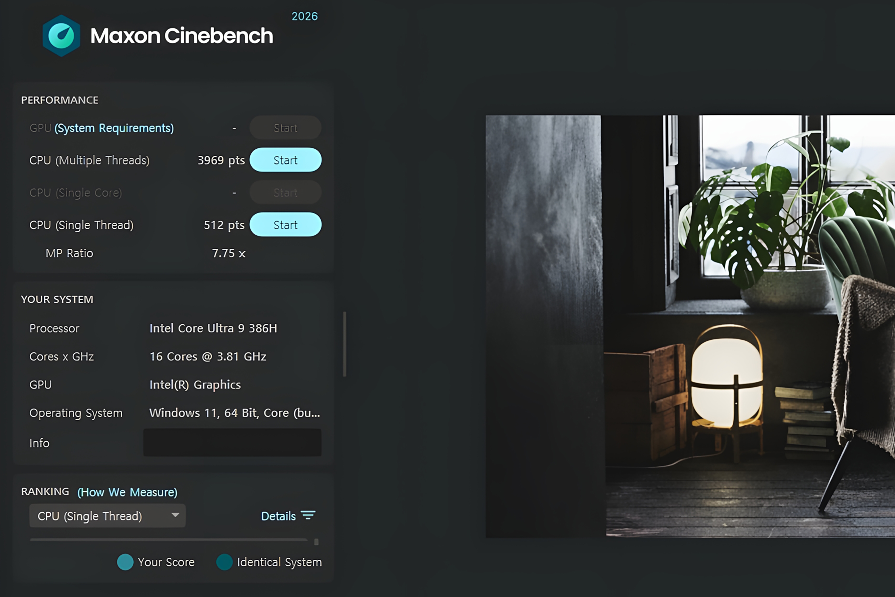 MSI 프레스티지 14 AI+ 노트북에 탑재된 인텔® 코어™ Ultra 9 프로세서 386H는 P-코어 4개, E-코어 8개, LP E-코어 4개가 포함된 16코어로 구성되어 있는데요. Maxon 시네벤치 (Cinebench) 2026을 통해서 살펴보면 CPU (멀티 스레드)는 3,969 pts, CPU(싱글 스레드)는 512 pts로 측정되었습니다.