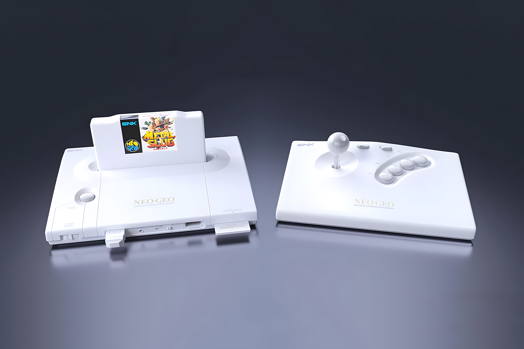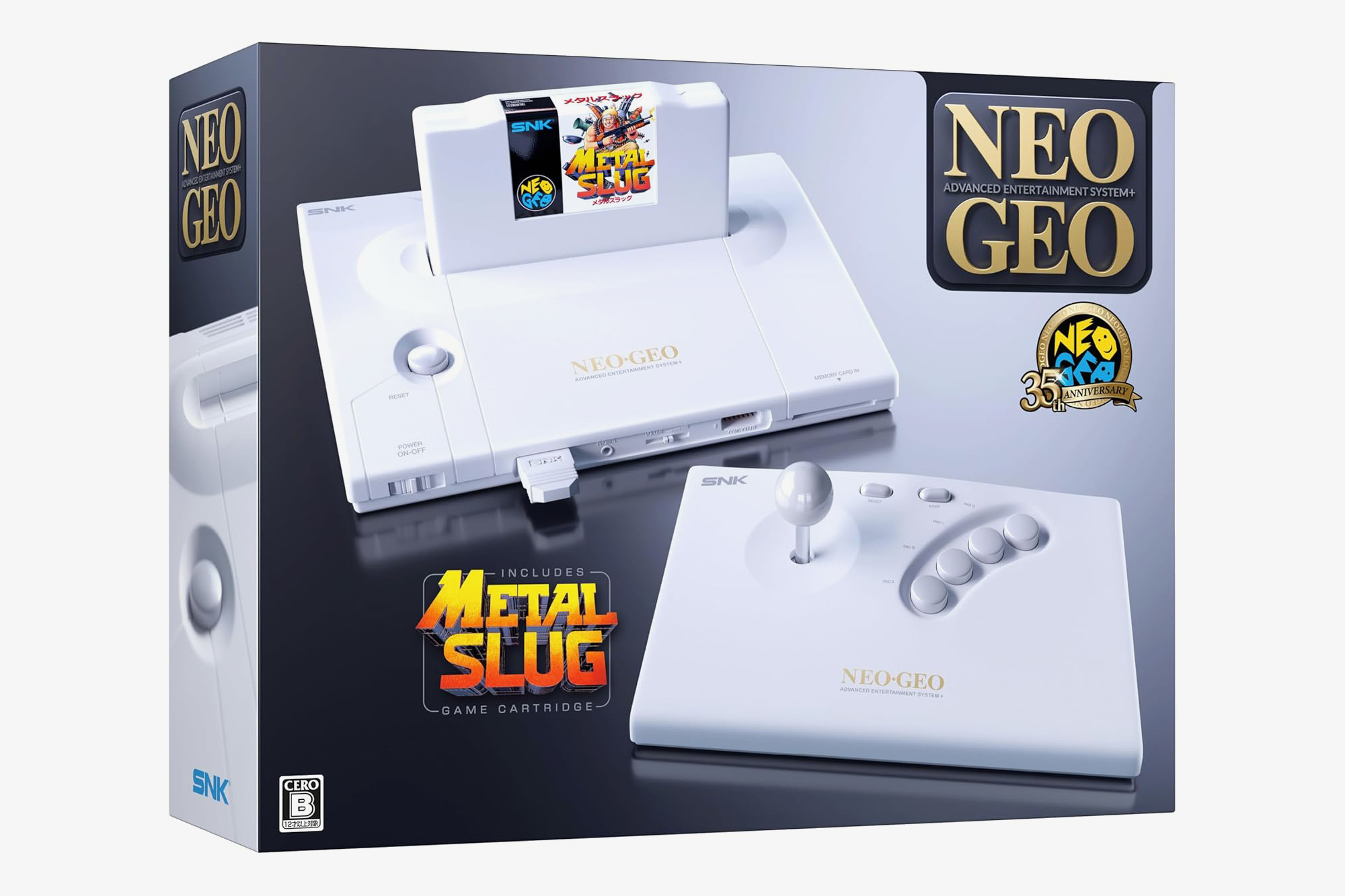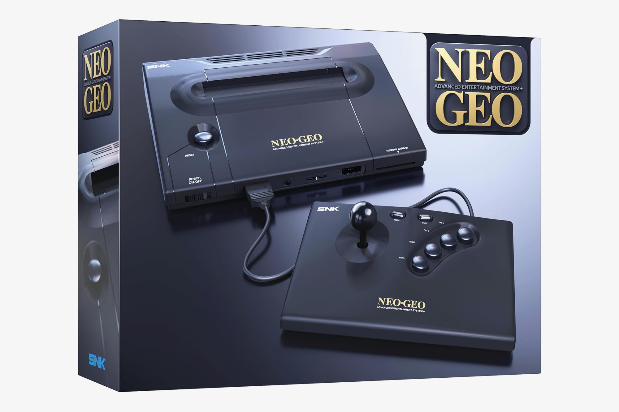 구성품 : 네오지오 AES+ 본체, 무선 아케이드 스틱, 메탈 슬러그 게임 카트리지, 메모리 카드, 아케이드 스틱용 무선 동글, 아케이드 스틱용 15핀 케이블, 아케이드 스틱용 USB-C 충전 케이블, HDMI 케이블, 2A 전원 어댑터