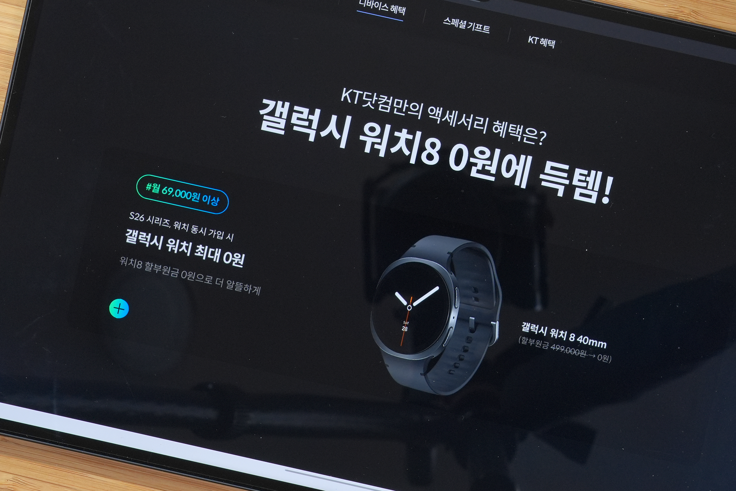 제가 이 포스팅을 작성하는 이유는 바로 KT닷컴에서 갤럭시 S26시리즈를 구매하고 월 69,000원 이상 요금제에 가입하면 갤럭시 워치8 40mm 할부원금을 0원으로 할인되기 때문인데요. 스마트폰과 함께 스마트워치까지 구매하려는 분들에게 메리트있는 소식이라고 할 수 있습니다.