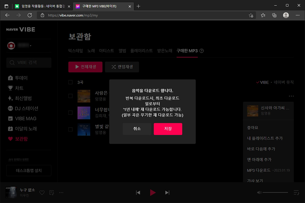 임영웅 노래 MP3로 구매와 다운 방법! 네이버 바이브에서