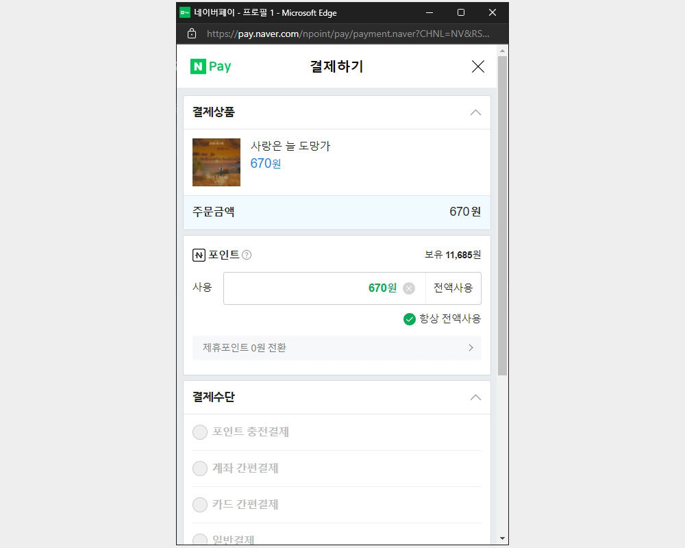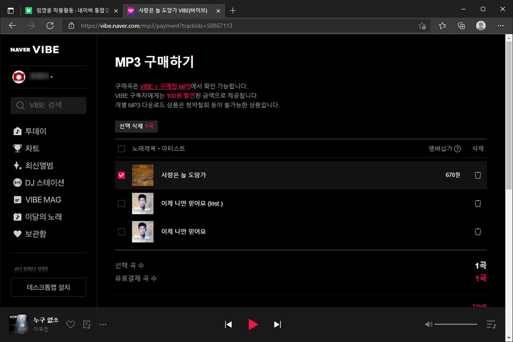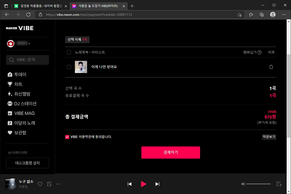 MP3 구매하기 메뉴를 선택하면 가격이 표시됩니다. 참고로 일반적으로 판매되는 가격은 770원이고 저는 네이버 바이브를 구독하고 있기 때문에 100원 할인되어서 670원으로 결제를 했습니다. 멜론이나 지니뮤직 그리고 플로, 벅스 에서도 구매 방법이 크게 다르지 않을 것 같습니다.