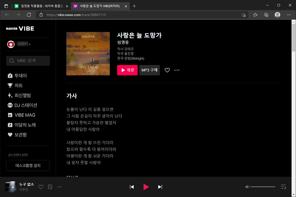 저는 “사랑은 늘 도망가”를 선택했더니 네이버 바이브로 이동하는 것을 확인할 수 있습니다. 스트리밍으로 재생을 하려는 분들은 구독을 해야 하고 저는 MP3 구매를 선택했습니다.