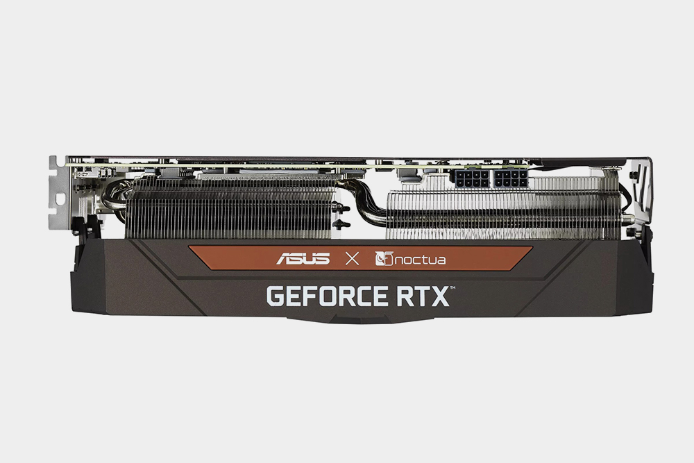 ASUS 지포스 RTX 3080 O10G NOCTUA EDITION OC D6X 10GB은 상당히 두꺼운 스타일로 디자인되었고 옆쪽에는 전원을 공급하기 위한 2개의 8핀 전원 단자가 배치되어 있는 것을 확인할 수 있습니다.