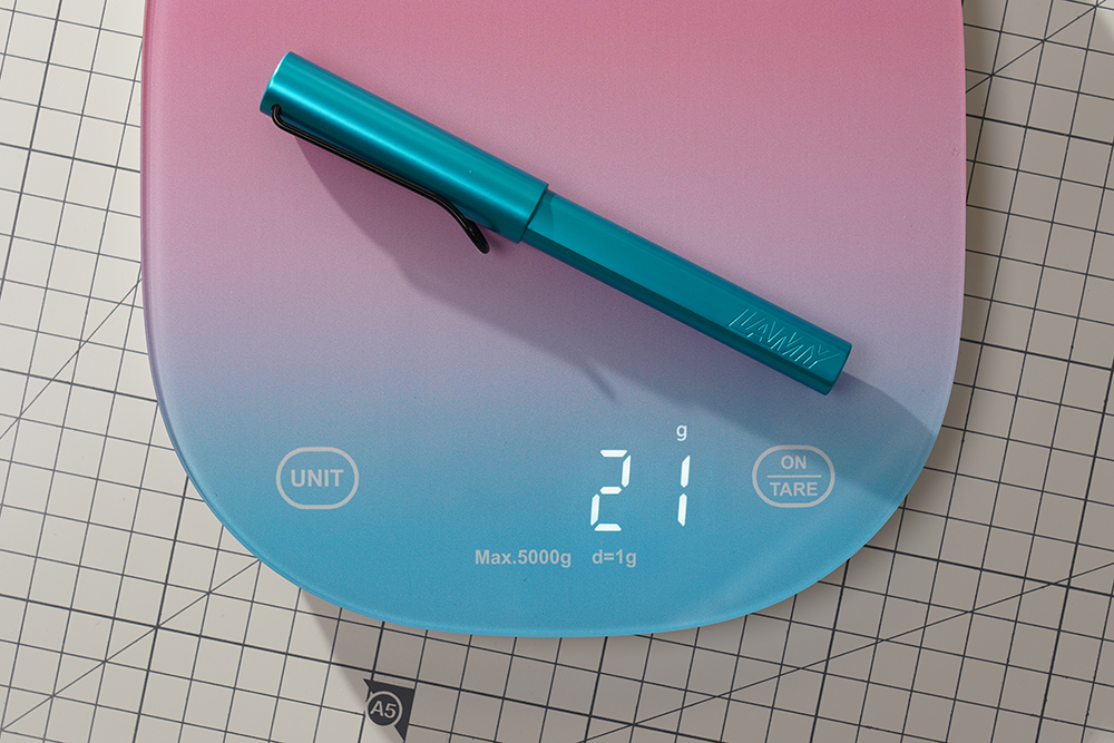 라미 알스타 S펜의 무게는 약 21g으로 측정되었습니다. 알루미늄으로 제작되어서 가볍다고 이야기하기는 어렵겠지만 필기를 하거나 그림을 그리는데 크게 불편한 정도는 아니라고 생각되었습니다.
