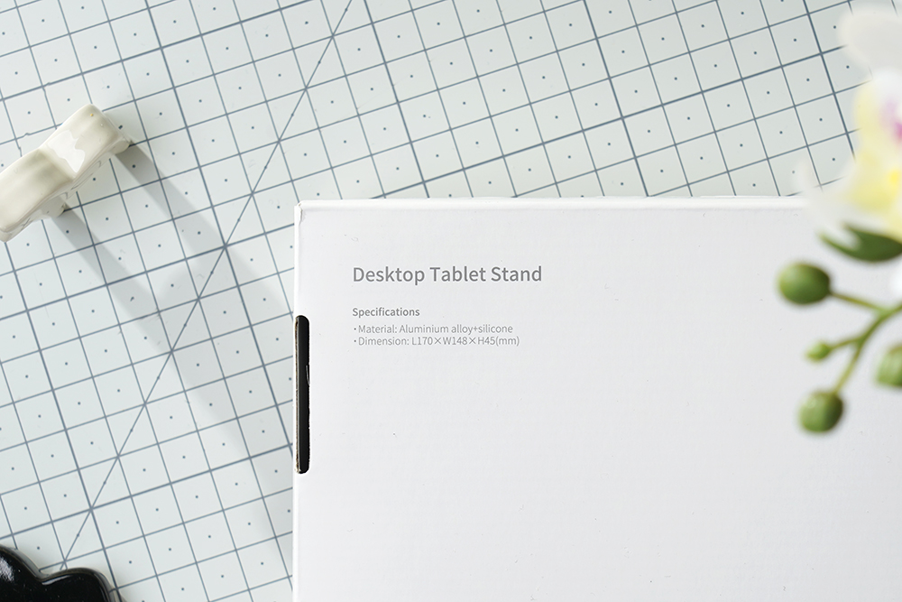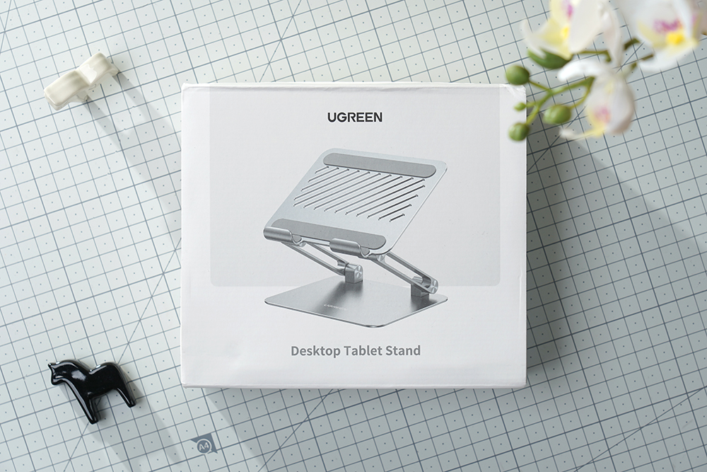유그린 더블폴딩 태블릿 거치대의 박스는 깔끔한 화이트 컬러로 제작되었고 전면에는 데스크톱 태블릿 스탠드(Desktop Tablet Stand)라는 문구가 인쇄되어 있습니다.