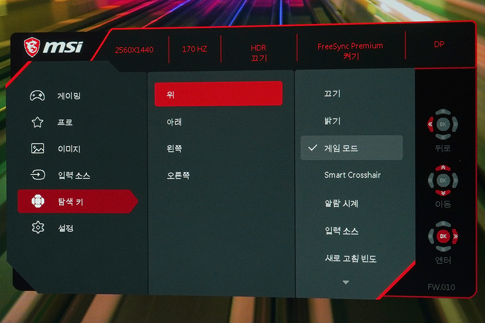 조이스틱을 누르면 OSD 메뉴가 실행되는데요. 상단에는 각종 정보가 표시되고 게이밍에서는 게임 모드나 야간 시력 그리고 다양한 게임 관련 기능들을 변경하고 실행할 수 있습니다.