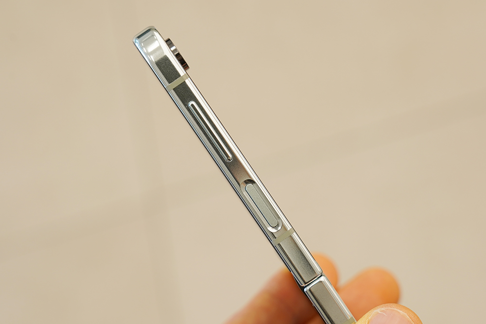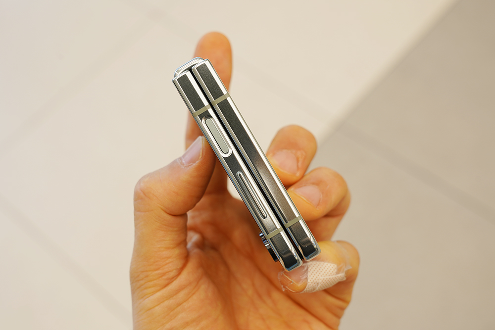 갤럭시 Z 플립5의 옆면을 살펴보면 약간은 플랫한 느낌의 메탈로 제작되었고 잠금 해제를 위한 지문인식 센서가 배치되어 있습니다. 위치는 적절한 편이라고 판단되었습니다.