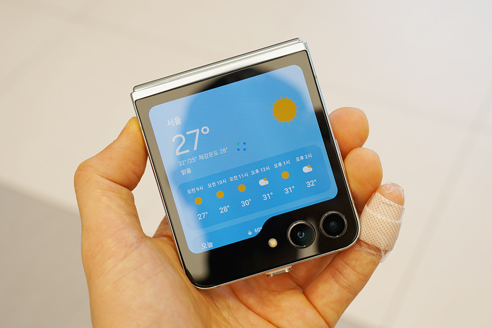 갤럭시 Z 플립5에는 6.7인치(170.3mm) FHD+(2640 x 1080) 해상도의 다이내믹 AMOLED 2X 인피니티 플렉스 디스플레이가 탑재되었습니다. 이전 세대의 제품과 비교해서 내구성이 높아졌다고 하지만 주름은 크게 개선된 것 같지는 않습니다. 그리고 크기는 성인 남성이나 여성이 한 손으로 사용하기에 크게 부담이 되는 편은 아니라고 판단되었습니다.