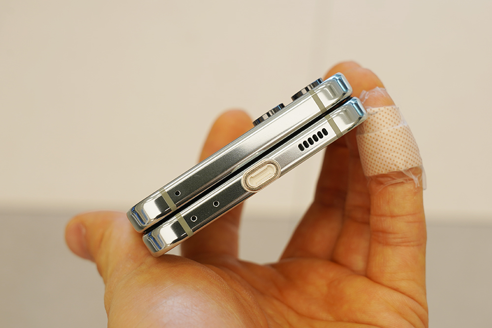 아래쪽을 살펴보면 USB-C 3.2 Gen1 포트가 탑재되었습니다. 참고로 플립4의 경우에는 USB 2.0이라서 사진이나 동영상 전송 속도가 느렸는데요. 개선된 부분이라고 할 수 있습니다. 그리고 당연하게도 3.5mm 이어폰 단자는 없습니다.