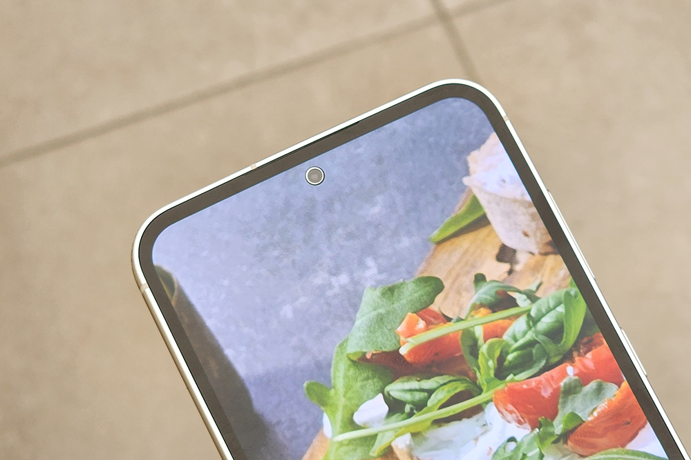 갤럭시 S23 FE의 상단을 살펴보면 1,000만 화소의 전면 카메라가 탑재되었습니다. 재미있는 부분은 테두리 부분에 은색의 포인트가 들어가 있다는 점입니다.