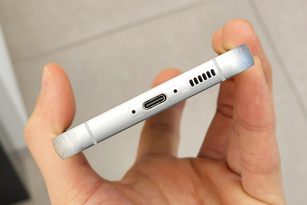 갤럭시 S23 FE의 아래쪽을 살펴보면 USB 3.2 Gen1 인터페이스를 지원하는 C타입 포트가 배치되어 있습니다. 속도가 빠른 편이어서 빠르게 사진이나 동영상 데이터를 전송할 수 있다는 장점이 있습니다.